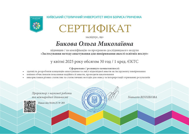 Упродовж квітня 2025 року завідувач кафедри міжнародної журналістики, гарант освітньої програми «Міжнародні медіа та цифрові комунікації» Віталій Терещук та доцент кафедри, гарант освітньої програми «Міжнародна журналістика» Ольга Бикова проходили підвищення кваліфікації за програмою дослідницького модуля «Застосування методу анкетування для вимірювання якості освітніх послуг» обсягом 1 кредит ЄКТС (30 годин).