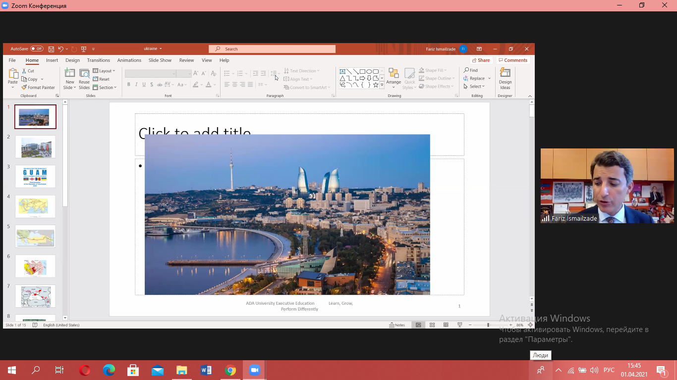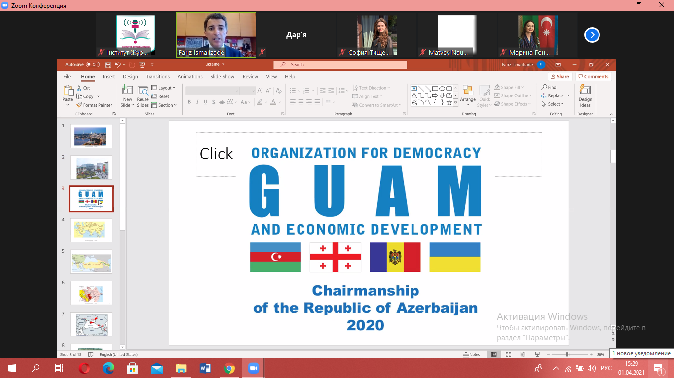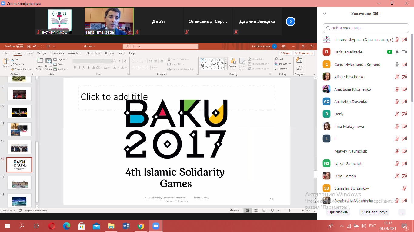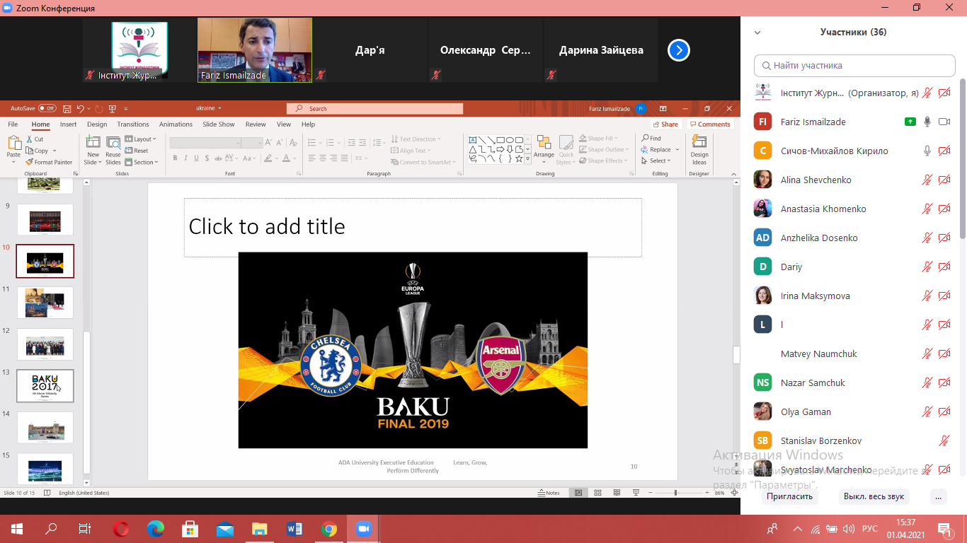 У межах дистанційного навчання 1 квітня 2021 року пройшла зустріч з проректором ADA UNIVERCITY Фарізом Ісмаілзаде на тему: «Україно-азербайджанські дипломатичні відносини».