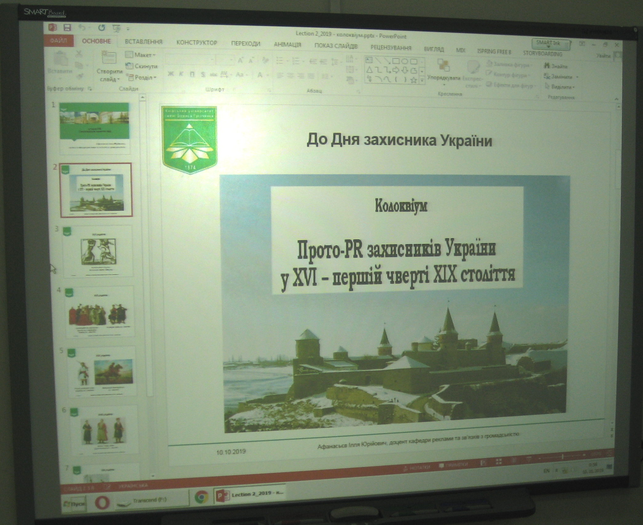 Студенти 1-го курсу бакалаврату, майбутні рекламісти і піарники, ознайомилися з поняттям “колоквіум” і провели “пробу пера”, отримали перший досвід у цьому виді навчальної активності. Студенти поділилися з колегами й викладачем своїми знаннями, думками, міркуванням щодо ініціаторів, посередників інформаційного впливу, основних засобів, що використовувалися в XVI – першій чверті ХІХ ст. на території України для підвищення престижності захисту рідної землі від агресорів, для посилення мотивації вояків. Розглянули елементи PR у діяльності гетьмана Петра Конашевича-Сагайдачного, письменника Івана Котляревського, деяких інших діячів того періоду, протягом якого в Україні утверджувалася теза, що перо може бути сильнішим за шаблю.