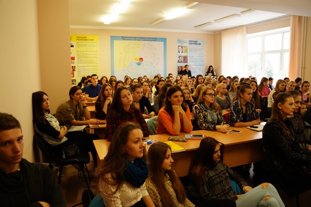 Яна Холодна, ведуча радіоефіру та продюсер радіостанції «Армія FM» розповіла студентам про роботу першої української військової радіостанції. «Армія FM» – це сучасна радіостанція, яка почала працювати 1 березня 2016 року. Вона веде мовлення в форматі FM, мережі Інтернет та через супутник і забезпечує україномовну трансляцію у зону АТО. Це допомагає підтримувати бойовий дух воїнів. Сучасний контент, якісна музика і інформація дозволяють радіостанції залучити до числа слухачів також місцеву аудиторію. Студенти були ознайомлені з особливостями роботи журналістів у зоні АТО. В кінці зустрічі Яна запросила студентів відвідати радіостудію і на власні очі побачити специфіку роботи цієї організації.