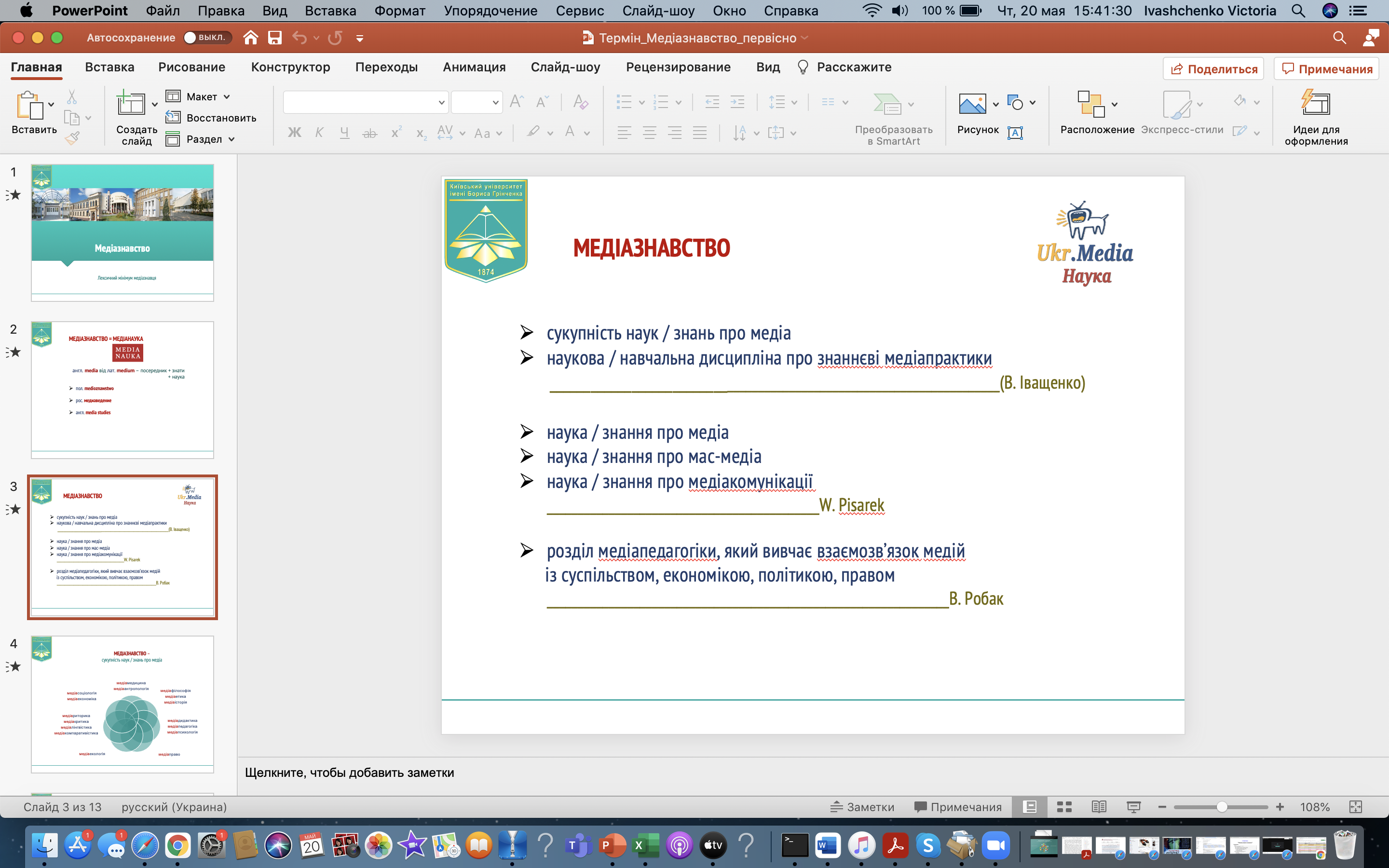 Учасниками семінару стали викладачі кафедри реклами та зв’язків із громадськістю – доктор історичних наук, професор Л.М. Новохатько; кандидат педагогічних наук, доцент Т.Ю. Бєлофастова; старший викладач Т.І. Ужанська; кандидат історичних наук І.Ю. Афанасьєв; кандидат наук із соціальних комунікацій С.М. Вернигора; кандидат юридичних наук, доцент О.Ш. Чомахашвілі; кандидат наук із соціальних комунікацій, доцент О.В. Курбан; кандидат історичних наук Г.А. Піскорська; кандидат наук із соціальних комунікацій М.М. Нетреба; кандидат політичних наук, доцент О.І. Стадніченко; кандидат історичних наук, доцент Л.М. Кононенко; старший викладач О.М. Яремчук; старший викладач З.В. Шевчук; старший викладач В.О. Шиян; викладач Д.В. Харамурза; викладач Є.С. Селюх; викладач М.А. Тебешевська; викладач О.М. Степаненко. Учасники семінару обговорили етапи подальшої роботи над науковою темою, зокрема питання архітектоніки аудіовізуального словника «Лексичний мінімум медіазнавця» як навчального ресурсу для студентів та викладачів (розподіл термінів із компонентом медіа за виконавцями, загальні принципи їх представлення в табличці Excel, формат створення презентацій для кожного з термінів та їхньої відуалізації за допомогою відеороликів). Було презентовано ролик про термін і відповідну галузь знання «медіазнавство», який підготували доктор філологічних наук В.Л. Іващенко та студентка 1-го курсу Інституту журналістики І.В. Валько, та робочу версію навчальтного ресурсу, технічне розроблення якого здійснила студентка 4-го курсу Факультету інформаційних технологій та управління А.О. Солоненко за керівництва кандидата технічних наук доцента кафедри комп’ютерних наук і математики В.О. Яскевича. Обговорювалося питання про активніше долучення студентів до виконання наукової теми.