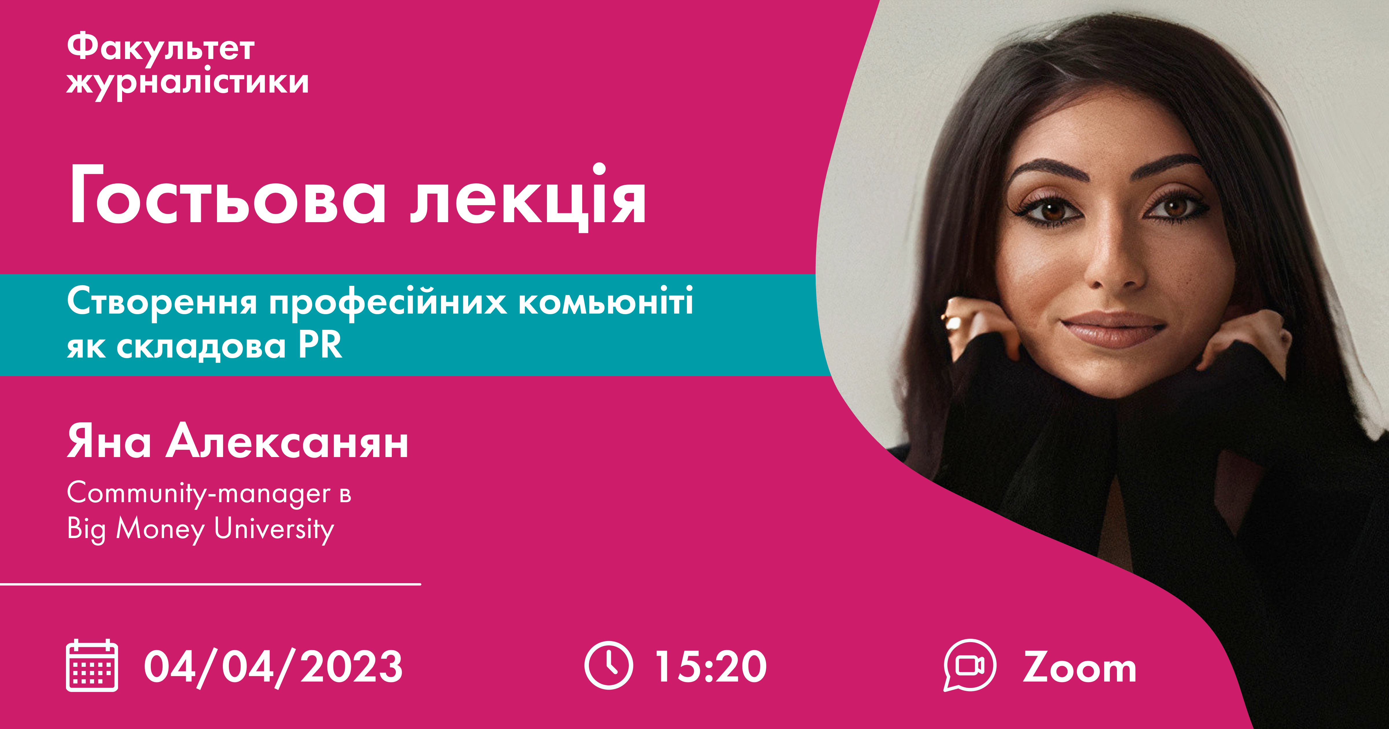 4 квітня 2023 року у рамках дисциплін «Сучасні digital-технології в рекламі та PR» та «Сучасні digital комунікації» відбулася гостьова лекція на тему «Створення професійних комьюніті як складова PR» в онлайн-форматі із запрошеною піарницею, ком’юніті-менеджеркою в освітньому середовищі для бізнесменів компанії Big Money University — Яною Алексанян.