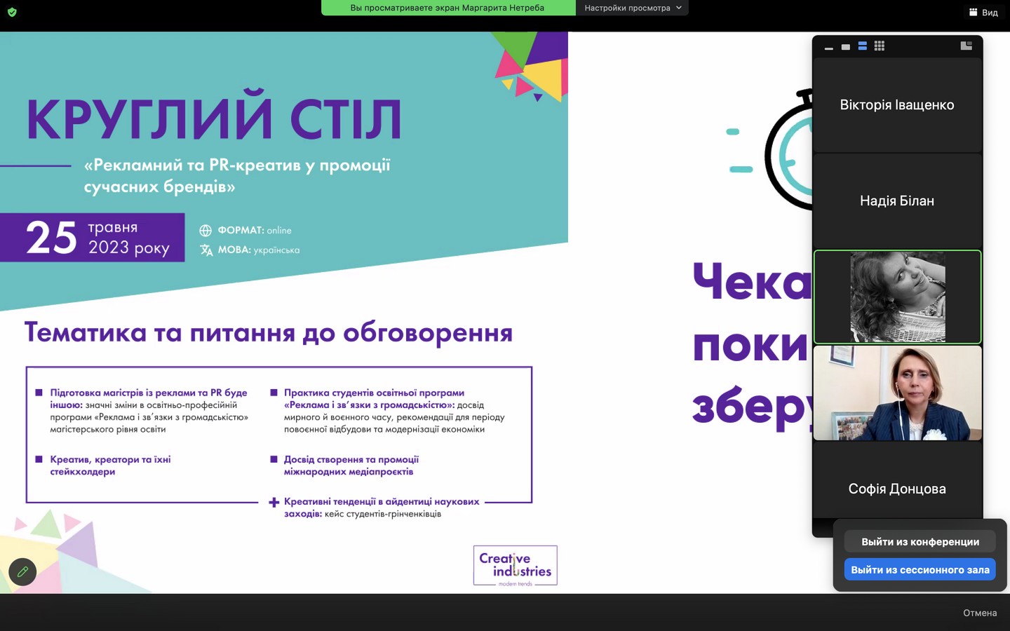 25 травня 2023 року в межах ІІ Міжнародної науково-практичної онлайн-конференції студентів, аспірантів, молодих учених та практиків «КРЕАТИВНІ ІНДУСТРІЇ: СУЧАСНІ ТРЕНДИ» відбувся онлайновий круглий стіл «Рекламний та PR-креатив у промоції сучасних брендів» як інтелектуальний обмін ідеями та практиками, у якому взяли участь науково-педагогічні працівники кафедри реклами та зв’язків з громадськістю, представники рекламних і PR-агенцій, громадських організацій, здобувачі освіти та випускники освітньої програми «Реклама і зв’язки з громадськістю». Модерував онлайн-зустріч Леонід Новохатько, завідувач кафедри реклами та зв’язків з громадськістю Факультету журналістики Київського університету імені Бориса Грінченка, доктор історичних наук, професор, заслужений діяч науки і техніки України.