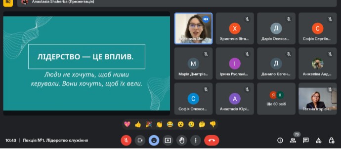 28 вересня 2023 року до першокурсників ОП «Реклама і зв’язки з громадськістю» на лекцію з Лідерства служіння завітала випускниця кафедри Анастасія Щерба, в минулому співробітниця Центру програм з лідерства служіння Університету Грінченка, а нині менеджер проєктів в “Institute of Cognitive Modeling”. Анастасія радо поділилася зі студентами власним шляхом до лідерства, страхами які довелося подолати та успіхом, який не забарився.
