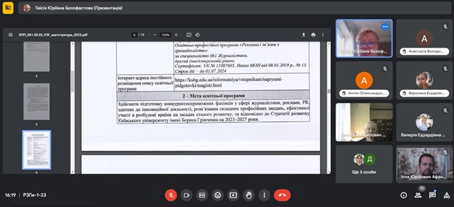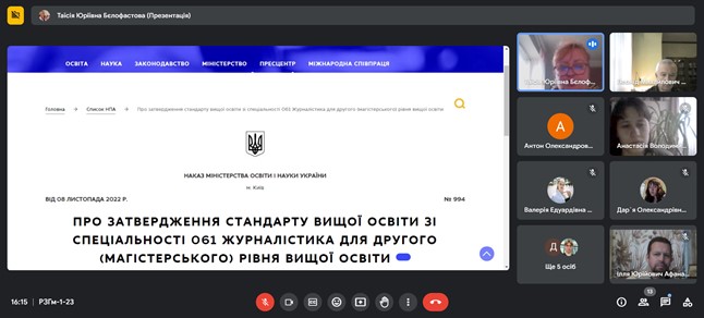 Під час зустрічі, в якій взяли участь проф. Леонід Новохатько та доц. Таїсія Бєлофастова, також було обговорено деякі характеристики Стандарту вищої освіти зі спеціальності 061 Журналістика другого (магістерського) рівня вищої освіти, засадничі складники названої та інших освітніх програм, проілюстровано деякі з цих документів.