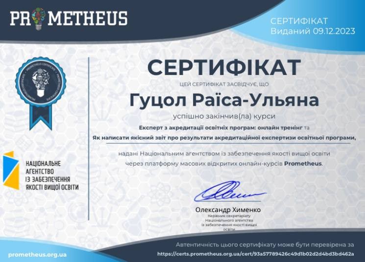 27 лютого 2024 року студентку І курсу освітньої програми-професійної «Реклама і зв’язки з громадськістю» Гуцол Раїсу-Ульяну було включено до реєстру експертів Національного агентства із забезпечення якості вищої освіти за спеціальністю 061 «Журналістика».