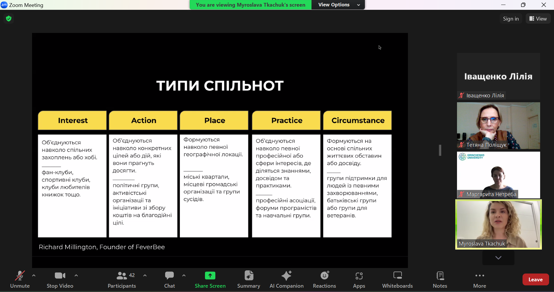 - Що таке спільноти та їхня типологія? Мирослава пояснила, що спільноти можуть бути різних типів: професійні, соціальні, інтересів та інші. Вона підкреслила важливість розуміння різних видів спільнот та їхньої ролі в сучасному цифровому світі.