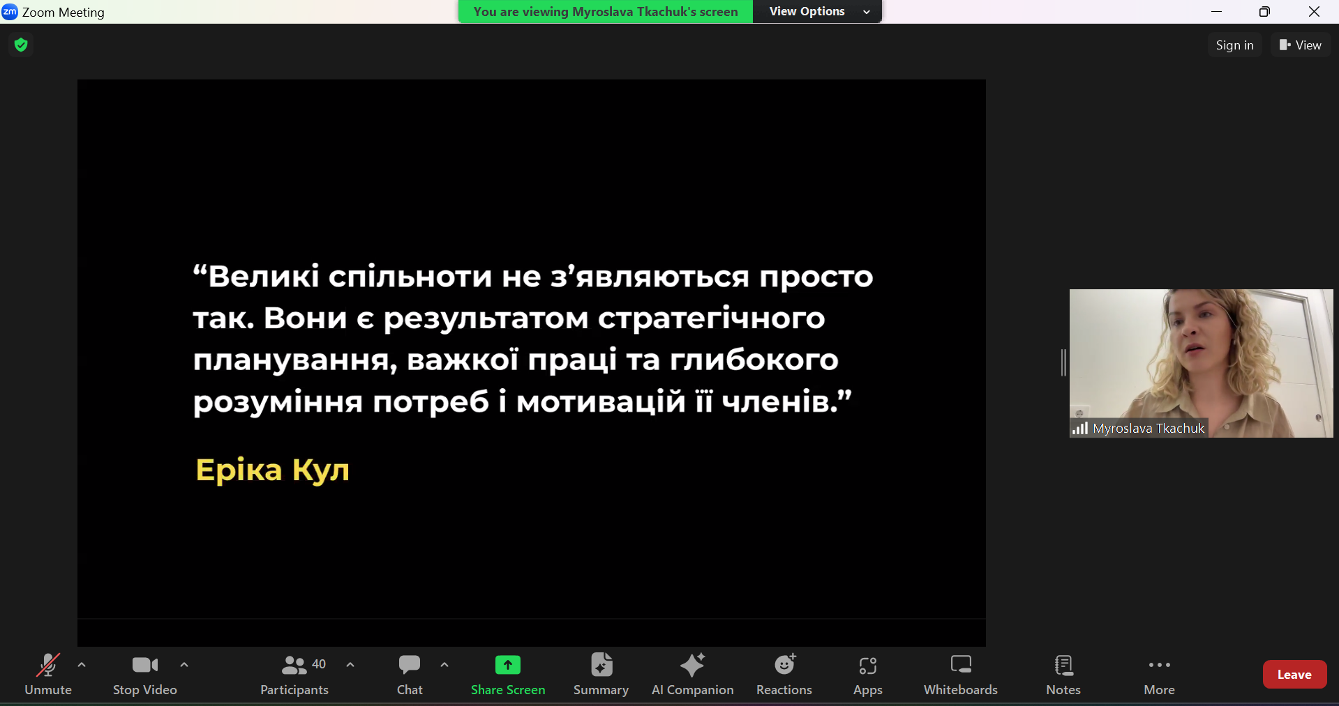 - Community Canvas. Під час лекції Мирослава представила Community Canvas — інструмент для планування та розвитку спільнот. Вона пояснила, як використовувати цей інструмент для створення структури спільноти, визначення її цінностей, місії та стратегій розвитку.