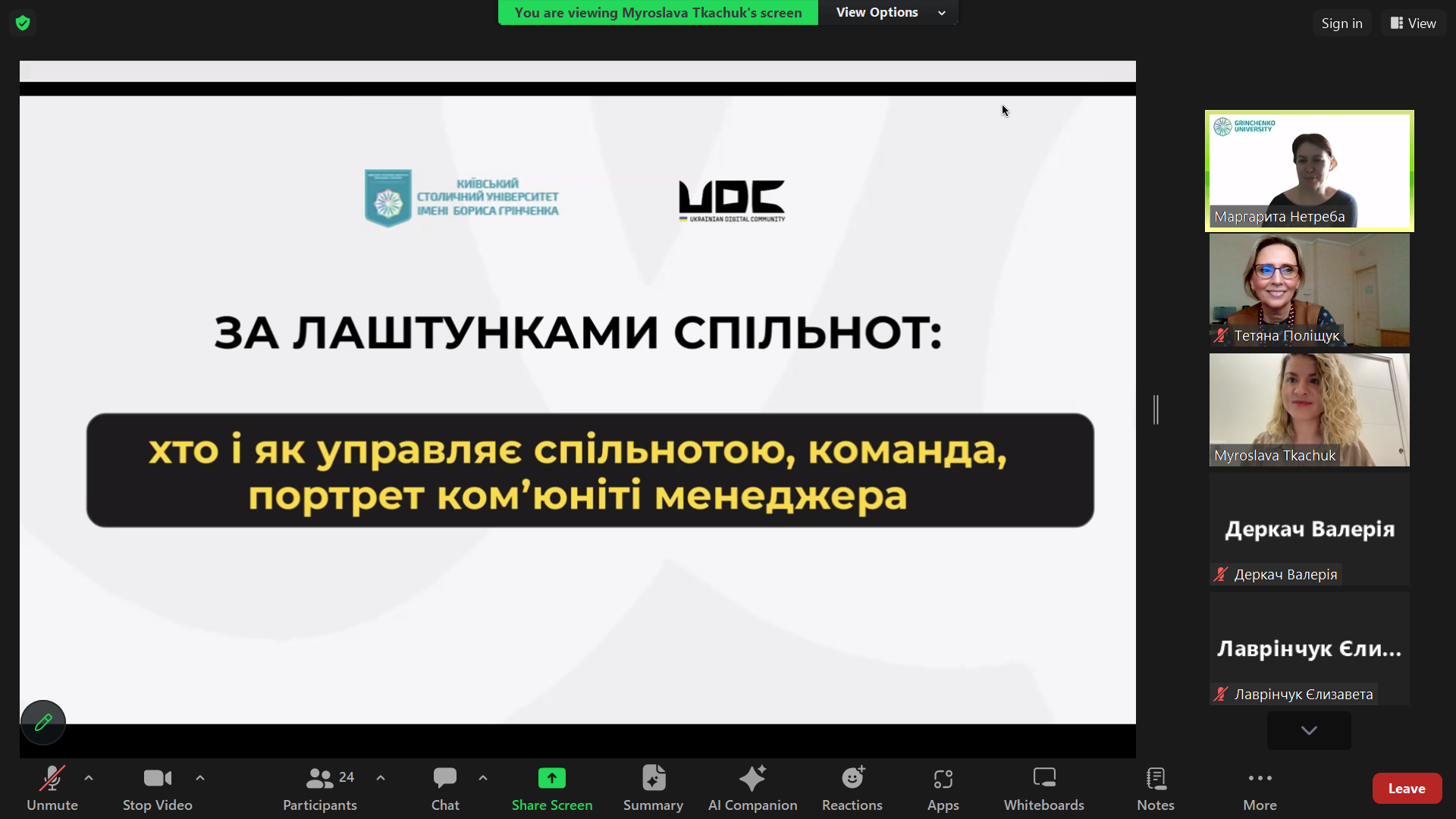 11 червня 2024 року в межах дисципліни «Ком’юніті менеджмент» відбулася онлайн-лекція на тему «За лаштунками спільнот: хто і як управляє спільнотою, команда, портрет комʼюніті менеджера», яку провела ком’юніті-менеджерка, співзасновниця та CEO Ukrainian Digital Community — Мирослава Ткачук.