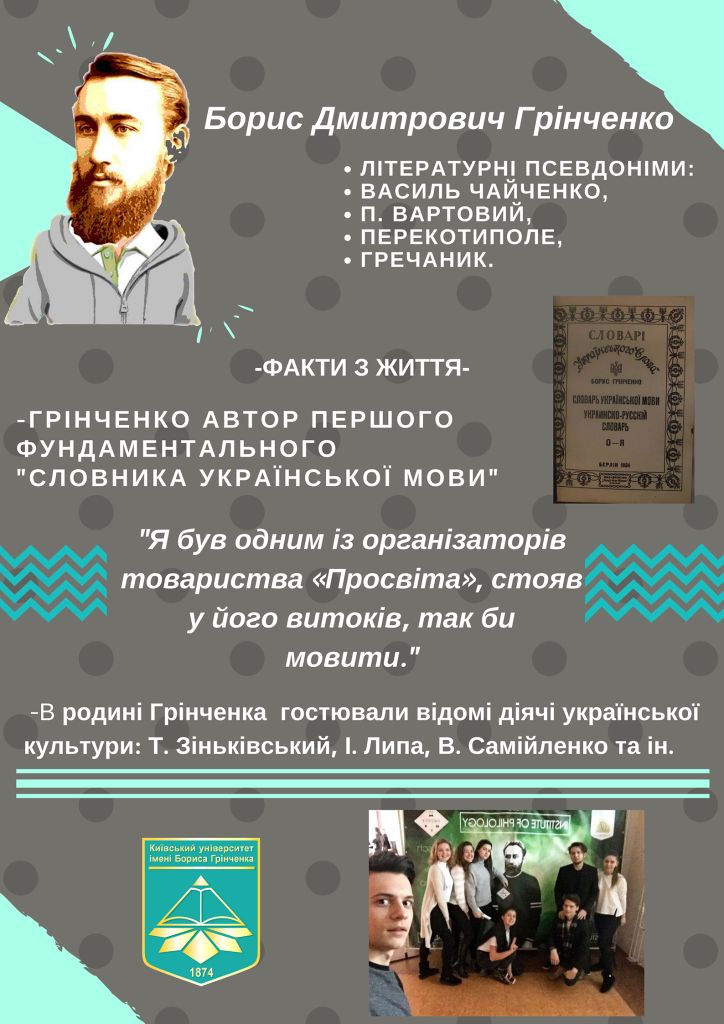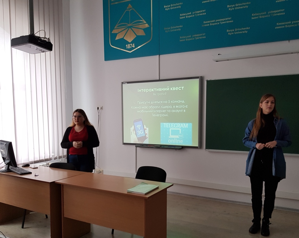 Квест здійснювався за допомогою чат-боту @BoryaGrinchenkoBot у Telegram та сервісу для створення інфографіки Canva.com. Стартовою точкою була 504 аудиторія. 5 команд по 10 осіб в кожній. Кожна команда обирала лідера (капітана), який спілкувався з ботом і вів за собою команду, а також двох дизайнерів, які під час гри знаходилися в Центрі мультимедійних технологій та працювали над фінальним завданням — створенням інфографіки під гаслом “5 постатей Бориса Грінченка”. Загалом гра містила 5 рівнів. Для інфографіки команда мала здобути в процесі розв’язання завдань певні елементи — фото, картинки, цікаві факти з життя Бориса Грінченка — та надіслати їх колегам-дизайнерам. Члени журі у складі Галини Горбенко, Іллі Афанасьєва, Маргарити Нетреби, Тетяни Ужанської та Наталії Базелюк мали оцінити якість створеної інфографіки. Жодна команда не залишилася без подарунків: солодощі, корпоративні листівки, наклейки та значки, купу позитивних емоцій та вражень. І хоча квест був не на швидкість, суперницький дух перегонів відчувався сповна. Першокурсникам сподобався такий формат заходу. Автори: Діана Кривуца та Яна Чепурнова, студентки 2 курсу спеціальності “Реклама та зв’язки з громадськістю”