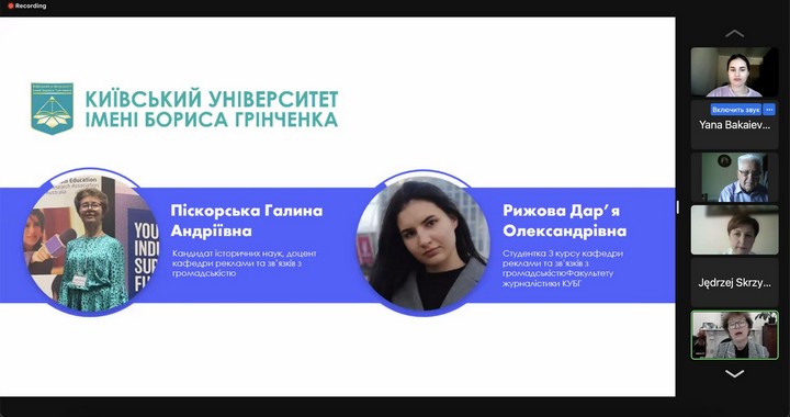 - доц. Галина Піскорська, доц. кафедри реклами та зв’язків з громадськістю Факультету журналістики Київського університету імені Бориса Грінченка, канд. іст. наук (Україна); Дар’я Рижова, студентка III курсу кафедри реклами та зв’язків з громадськістю Факультету журналістики Київського університету імені Бориса Грінченка (Україна). Тема: «Спільні зусилля медіа, громадських організацій та держави в боротьбі проти російської дезінформації»;