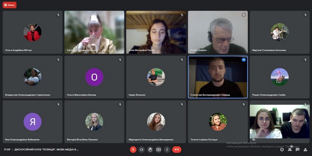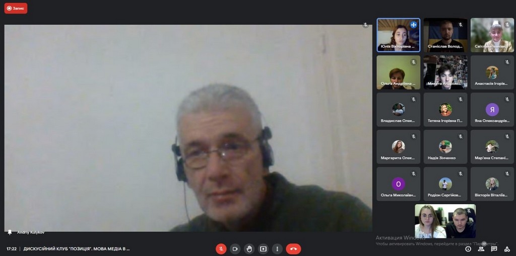 9 листопада, відбулося друге відкрите онлайн-засідання ДИСКУСІЙНОГО КЛУБУ “ПОЗИЦІЯ” факультету журналістики на тему “Мова медіа в умовах російсько-української війни. Чи витримують професійні стандарти та журналістська етика?” Дискусію підготували студенти 4 курсу під керівництвом доктора філософії, доцента кафедри журналістики та нових медіа Світлани Петренко.