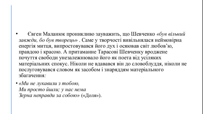 Український письменник, публіцист Євген Маланюк наголошував, що Шевченко «був вільний завжди, бо був творець».