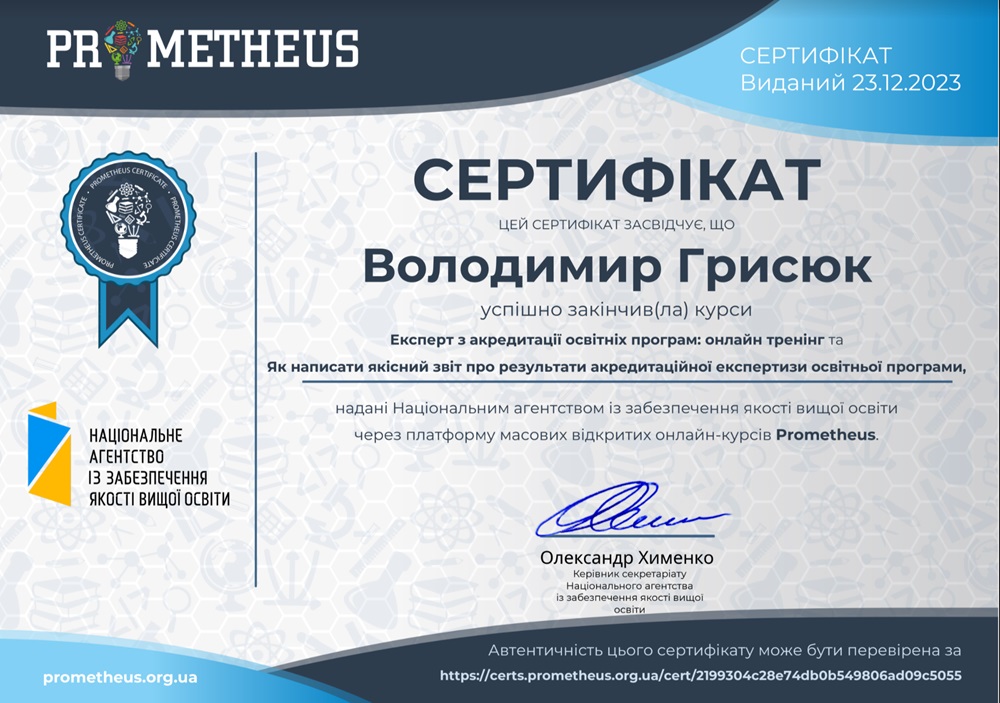 Наказом Національного агентства із забезпечення якості вищої освіти від 27 лютого 2024 року старшого викладача кафедри журналістики та нових медіа Володимира Грисюка включено в реєстр експертів з акредитації освітніх програм. Відповідно наш колега пройшов підготовчі курси на платформі Prometheus та отримав сертифікат.