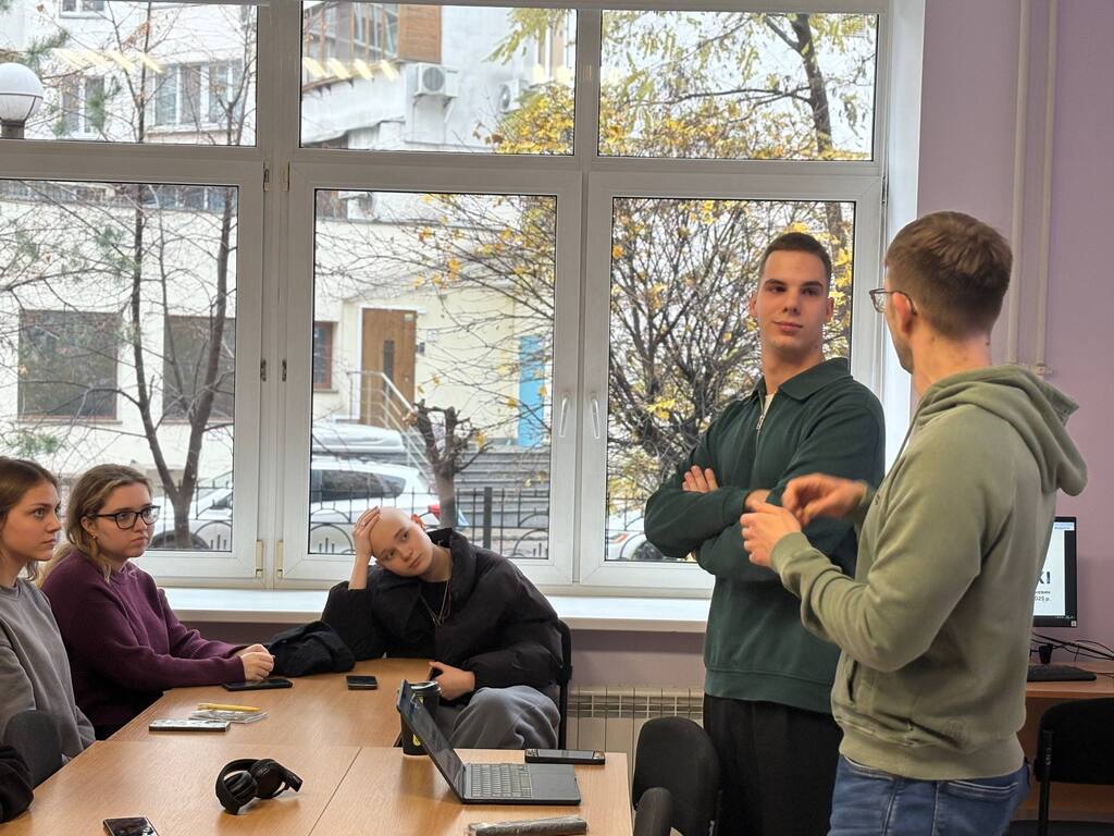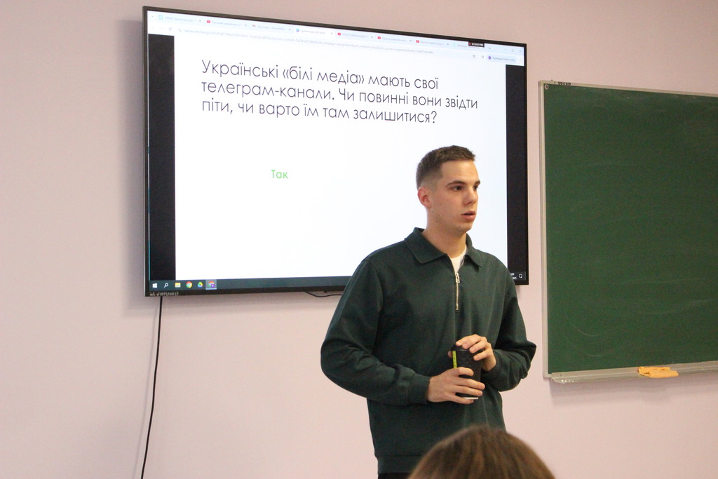 Роман, який у червні успішно захистив бакалаврський проєкт, тепер повернувся до рідного ЗВО вже в ролі спікера. Розповідав про дезінформацію, телеграм-канали, а також про те, як журналісту не потонути в морі (та де там морі – океані!) фейків.