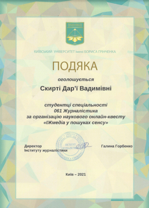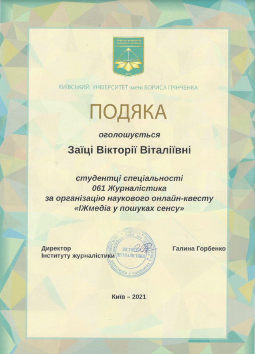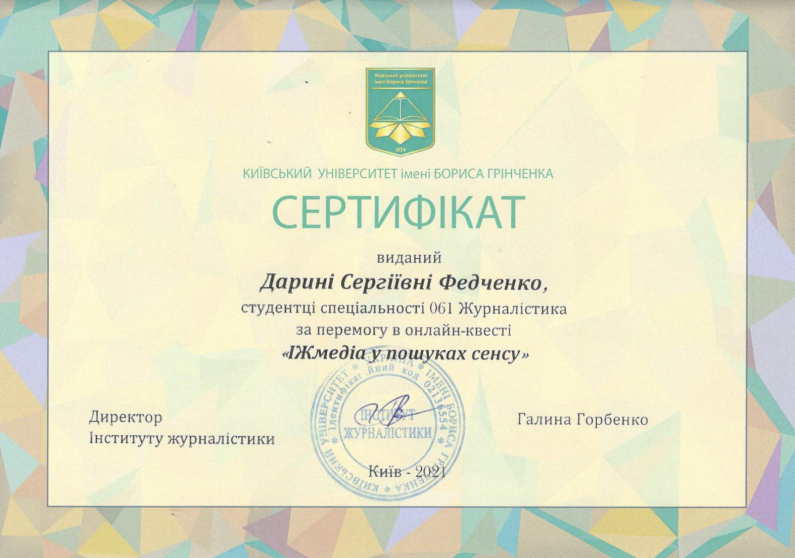 Переможницею наукового онлайн-квесту «ІЖмедіа у пошуках сенсу» стала Федченко Дарина Сергіївна (ВСРб-1-20-4.0д).