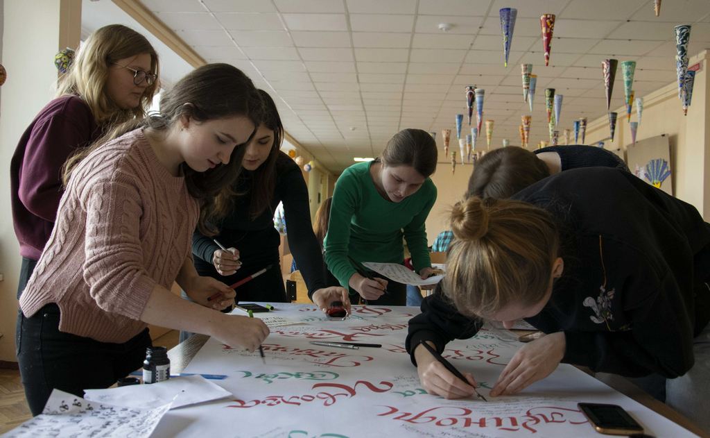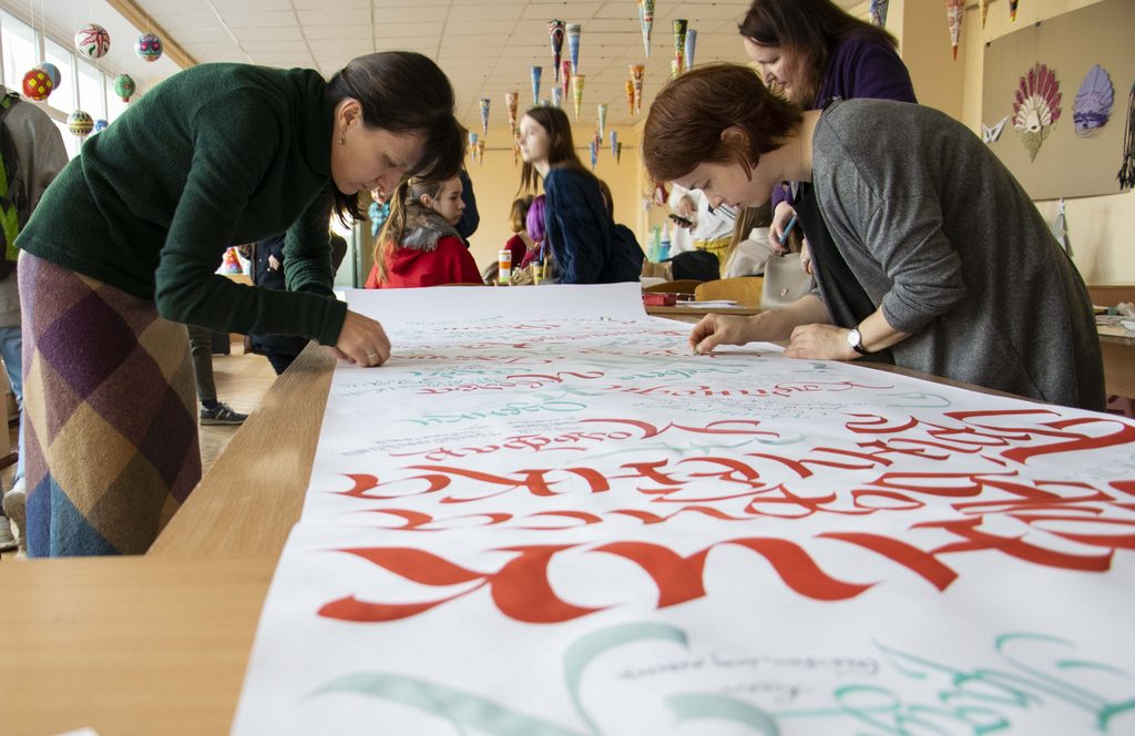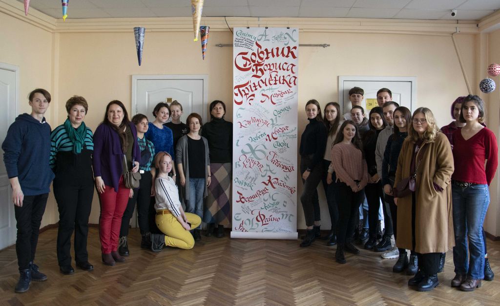 Студенти-другокурсники, які минулого навчального року опанували каліграфію, разом із викладачами розписали великий паперовий аркуш словами зі словника Бориса Грінченка, користуючись рукописним шрифтом різно їскладності. Писали гуашшю та чорнилом, майстерно виводячи кожну літеру. Кажуть, що кольори підбирали тільки для виразності, проте бачимо, що корпоративний колір грінченківців активно задіяний.