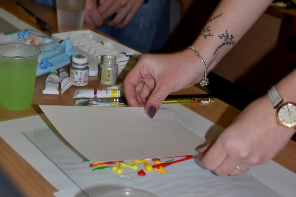 «Монотипія – це тиражна графіка, − пояснила вона, − де використовуються скло та акрилові фарби. Особливістю є те, що якщо ви робите композицію, з неї можна зробити навіть кілька зображень. До того ж, ви ніколи не знаєте, що у вас вийде, це все абстракція».