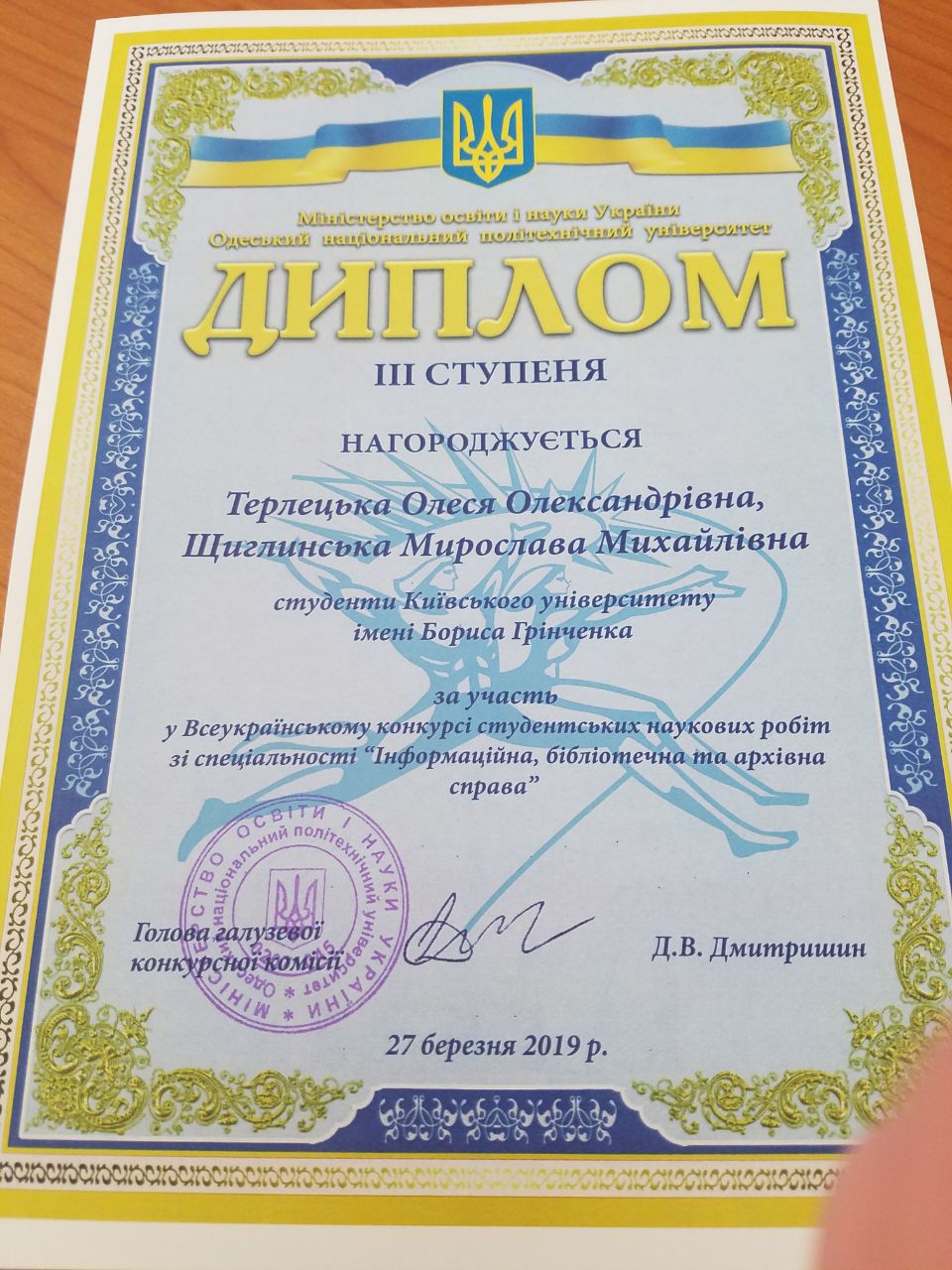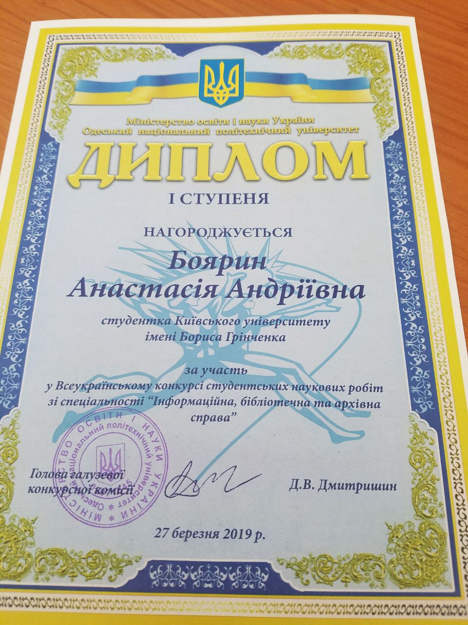 Щиро вітаємо з перемогою у Всеукраїнському конкурсі студентських наукових робіт зі спеціальності «Інформаційна, бібліотечна та архівна справа» студентку ІV курсу Інституту журналістики Анастасію Боярин, яка була нагороджена дипломом І ступеня та її наукового керівника Тетяну Поліщук, старшого викладача кафедри бібліотекознавства та інформології, а також студенток IV курсу Інституту журналістики Олесю Терлецьку і Мирославу Щиглинську, які були нагороджені дипломом ІІІ ступеня та їхнього наукового керівника Олену Воскобойнікову-Гузєву, доктора наук із соціальних комунікацій, старшого наукового співробіника.