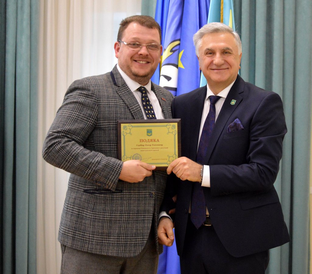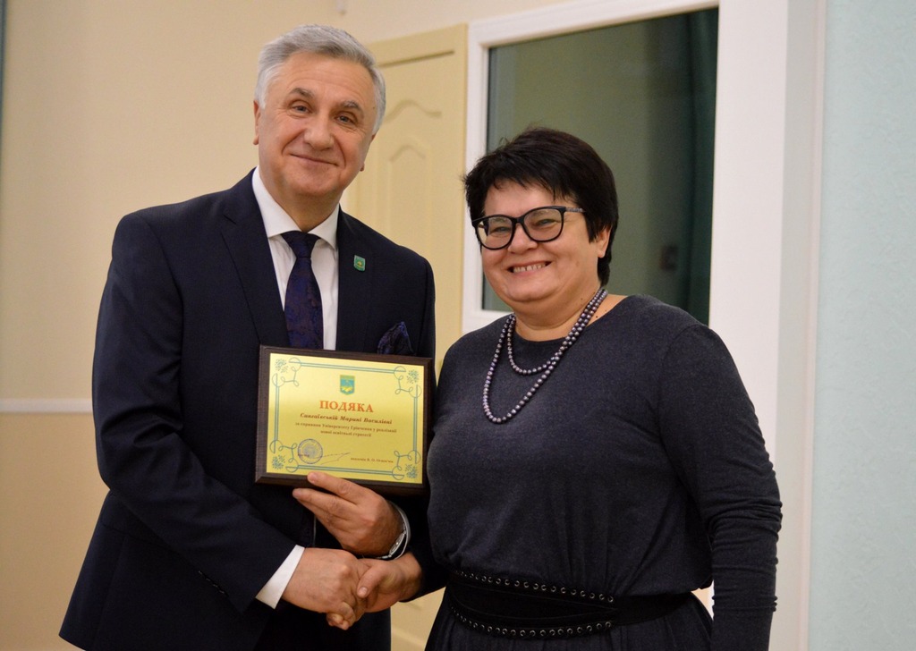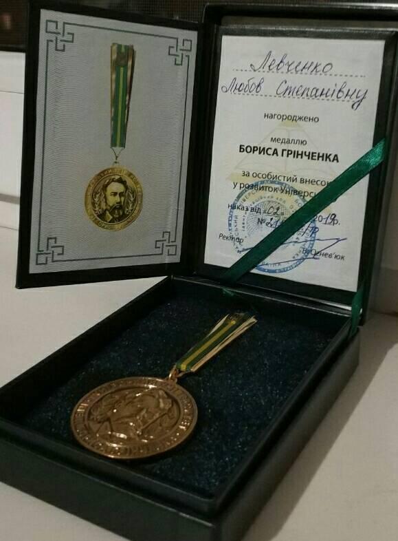 Також вітаємо керівника навчального відділу Левченко Любов Степанівну з нагородженням медаллю Бориса Грінченка за особисий внесок у розвиток Університету і студентку кафедри реклами та зв'язків з громадськістю Маргариту Соколовську з отриманням іменної стипендії Бориса Грінченка.