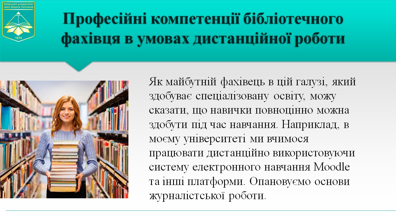 Свої виступи представили як випускники так і студенти кафедри бібліотекознавства та інформології. Так, зокрема, студентка 1 курсу Галактіонова Єлизавета провела аналіз компетенцій необхідних бібліотечному фахівця для дистанційної роботи.