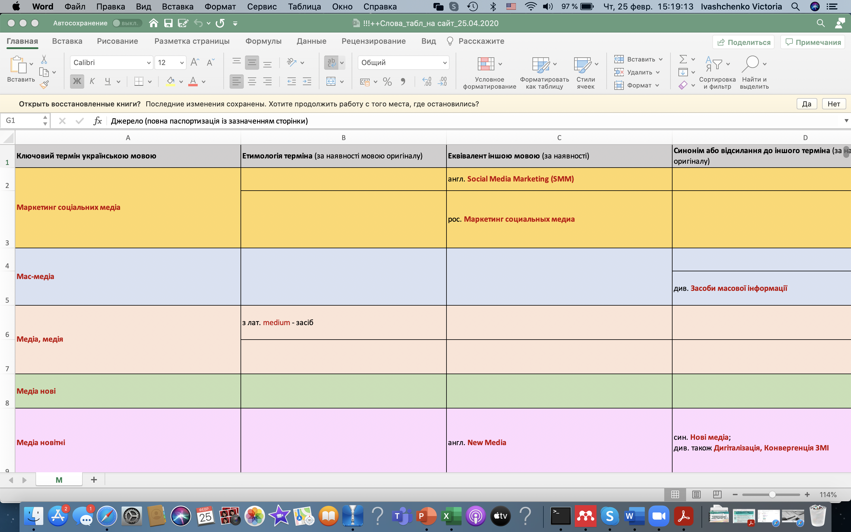 Обговорювалося питання: 1) пошуку формування дефінітивної бази до окремих термінів із компонентом медіа-; 2) структурування змісту наукового поняття, що його позначає термін із компонентом медіа-, задля подальшої візуалізації у форматі створення інтерактивного аудіовізуального е-словника.