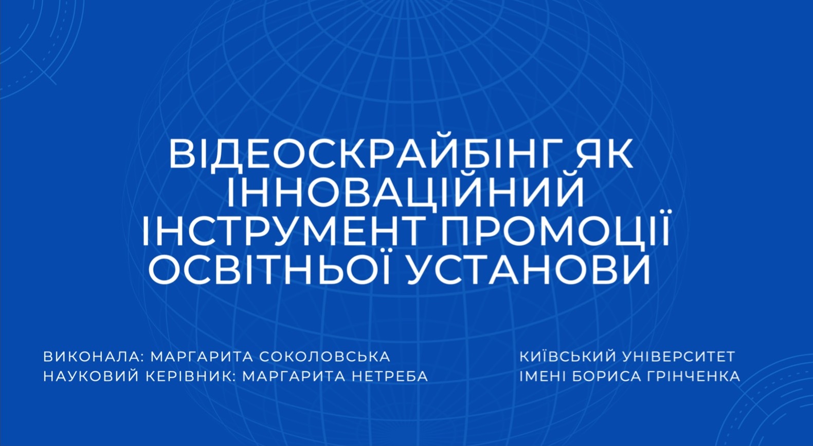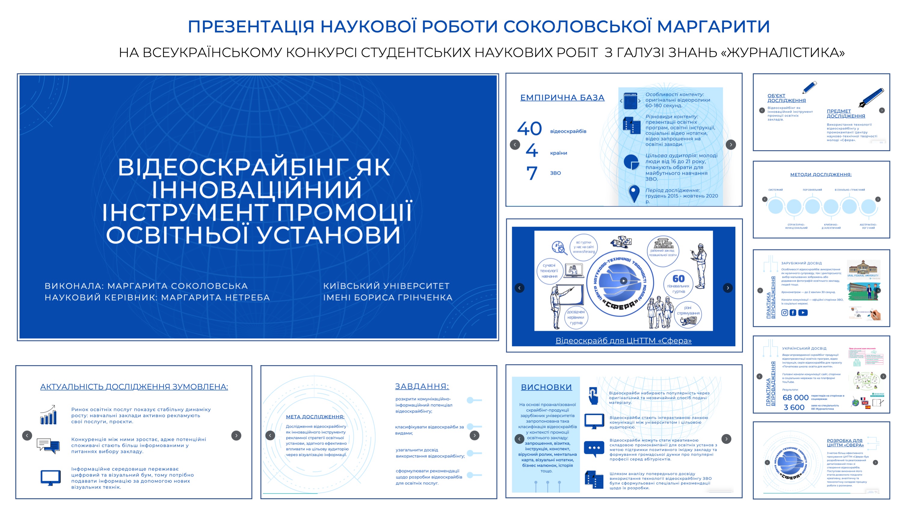 За результатами ІІ туру Всеукраїнського конкурсу студентських наукових робіт зі спеціальності «Журналістика», дипломом ІІІ ступеня нагороджено Соколовську Маргариту Олегівну, студентку IV курсу освітньої програми «Реклама і зв’язки з громадськістю» Інституту журналістики Київського університету імені Бориса Грінченка за роботу «Відеоскрайбінг як інноваційний інструмент промоції освітньої установи». Науковий керівник роботи доцент кафедри реклами та зв’язків з громадськістю Інституту журналістики Нетреба Маргарита Миколаївна.