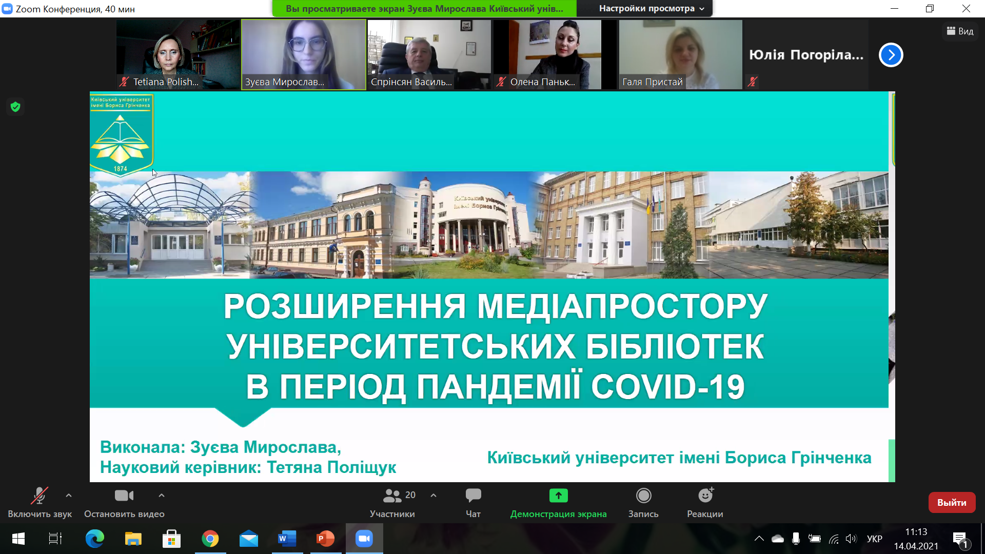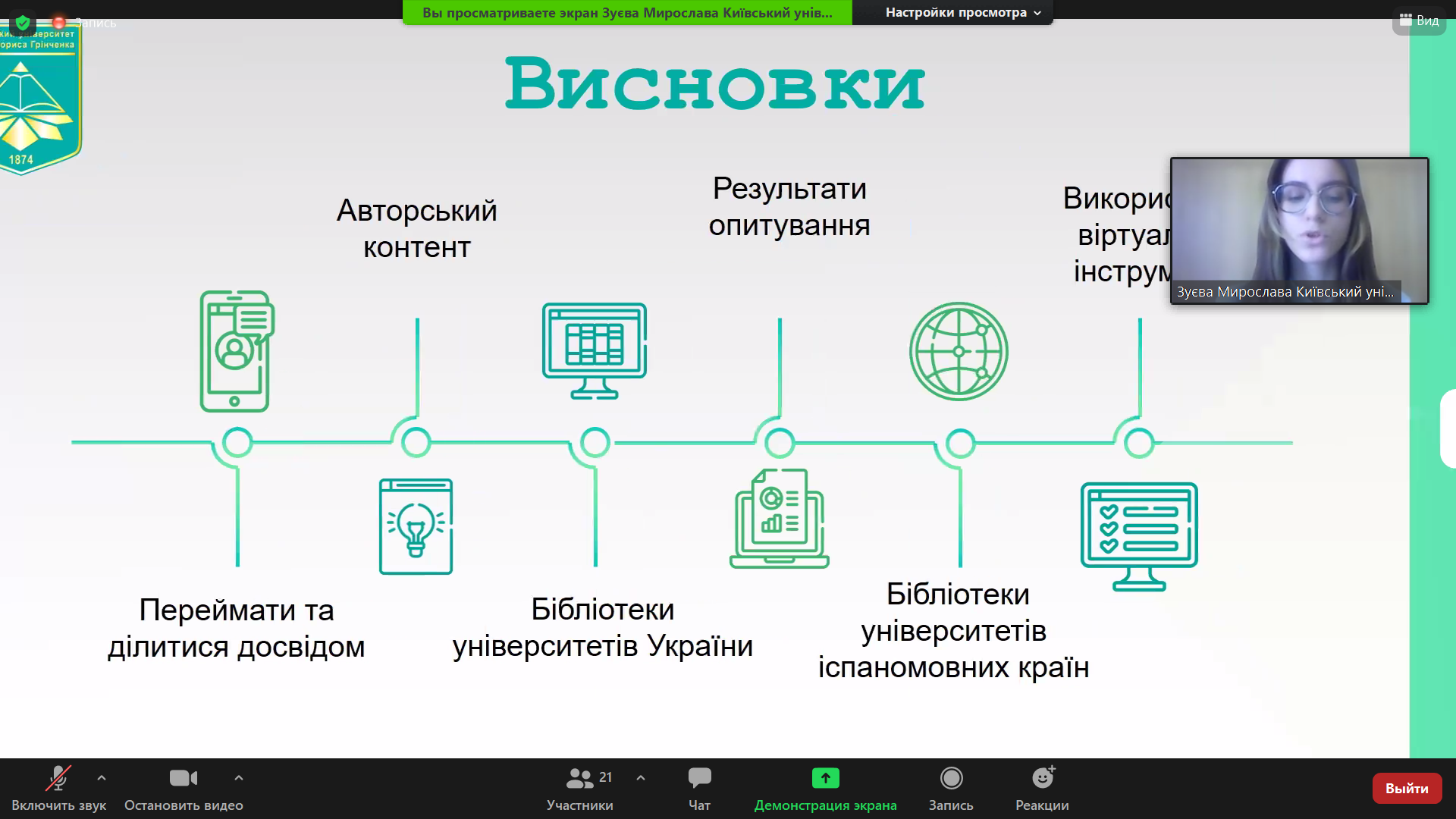 Студентка ІV курсу освітньої програми «Інформаційна, бібліотечна та архівна справа» Інституту журналістики Київського університету імені Бориса Грінченка Зуєва Мирослава Олександрівнапосіла ІІ місце, представивши наукове дослідження «Розширення медіапростору університетських бібліотек в період пандемії Covid-19». Науковий керівник – старший викладач кафедри бібліотекознавства та інформології Поліщук Т.І.