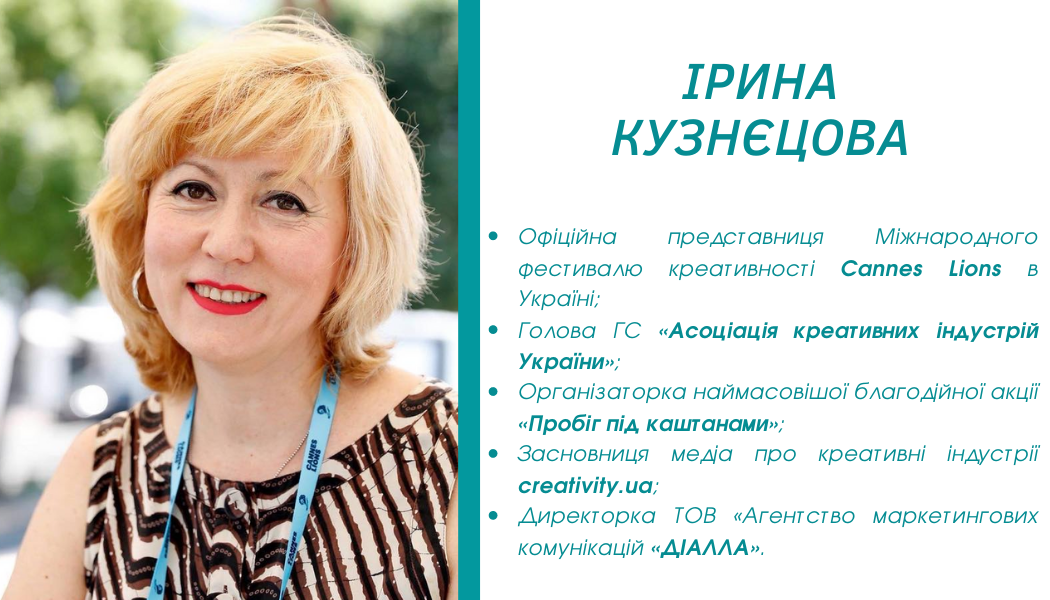 Докладніше про мегапопулярний фестиваль Cannes Lions розповіла Ірина Кузнєцова, офіційна представниця Міжнародного фестивалю креативності Cannes Lions в Україні, голова ГС «Асоціація креативних індустрій України», організаторка наймасовішої благодійної акції «Пробіг під каштанами», засновниця медіа про креативні індустрії creativity.ua, директорка ТОВ «Агентство маркетингових комунікацій «ДІАЛЛА». Аналізувавши ролики, пані Ірина наголошувала на тому, як важливо впроваджувати креативні підходи для привернення уваги та розкриття соціальних проблем. На прикладі кейсів переможців Cannes Lions студенти розібрали технології та інструменти, які було використано реалізованих кампаніях.