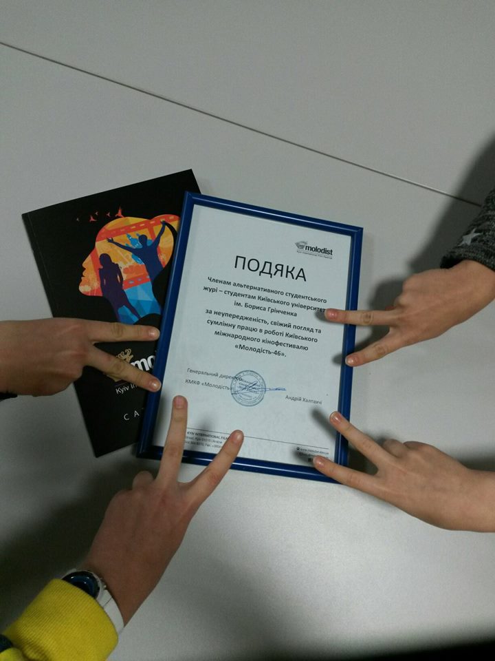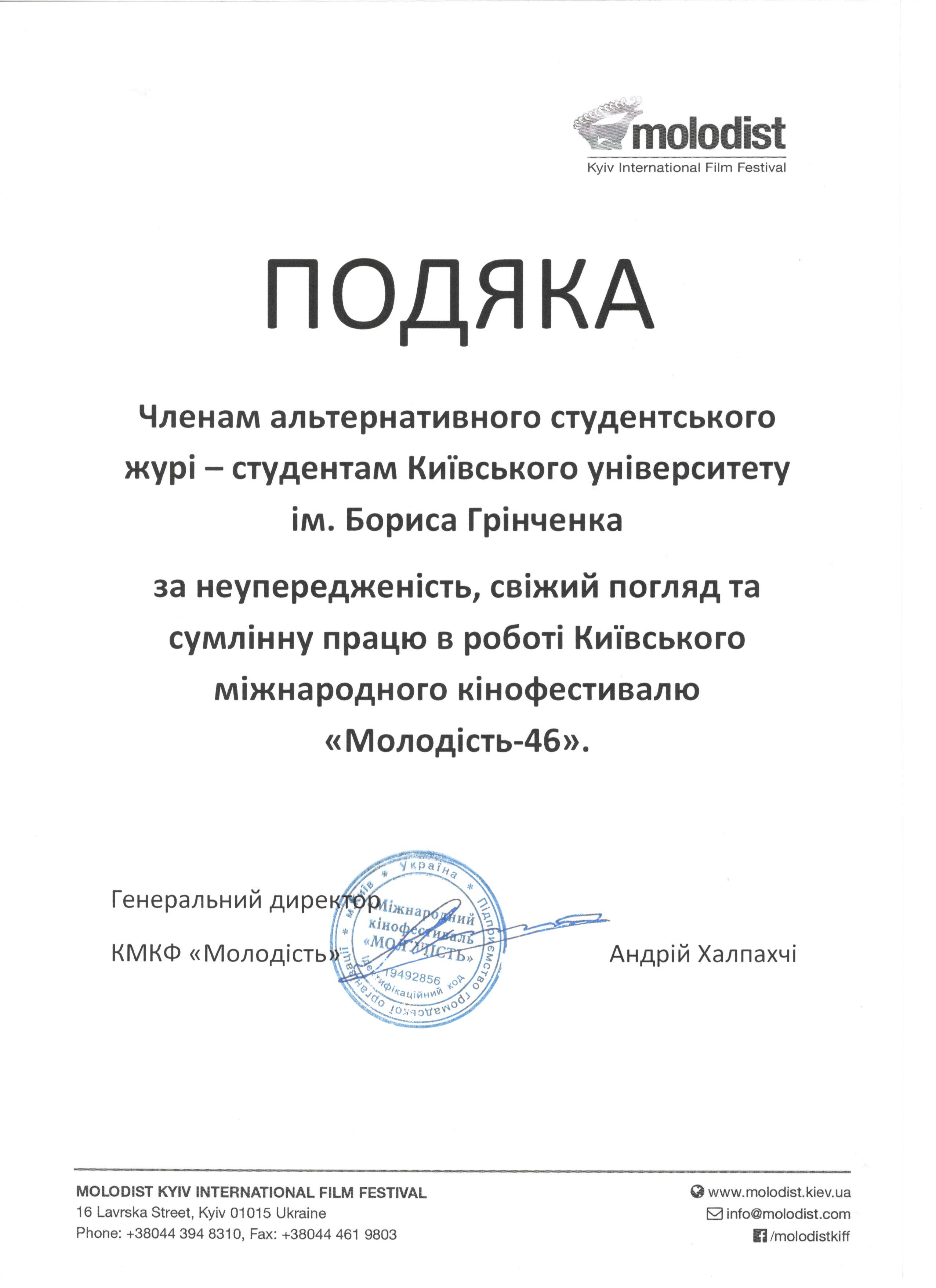 Генеральний директор КМКФ «Молодість» Андрій Халпахчі висловив «Подяку» членам альтернативного студентського журі – студентам Університету Грінченка за «неупередженість, свіжий погляд та сумлінну працю» в роботі Київського міжнародного кінофестивалю «Молодість-46».