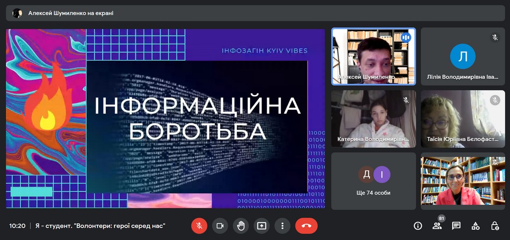 Олексій Шуміленко, член благодійного фонду «Солом’янські котики», інформаційний волонтер, керівник медіагуртка в КПДЮ, поділився надбаннями та досягненнями команди, що забезпечує інформаційну підтримку новин та фільтрування дописів про Україну, моніторинг західних медіа на рахунок поширення ними достовірної інформацію про події в Україні. Важливим моментом такого волонтерства, наголосив Олексій, є співпраця української інфоспільноти та викриття неточностей трактування подій в Україні, через поширені росією наративи.