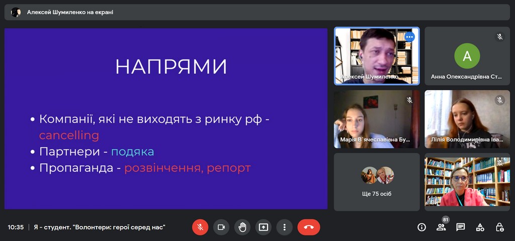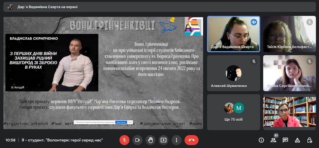 Дар'я Скирта та Владислав Нестеров подідилися досвідом створення та реалізації під час повномасштабного вторгнення важливих проєктів "інше життя війна" під кураторством Аліни Лісневської, доцента кафедри журналістики та "ВОНИ. Грінченківці" в яких розкривають досвід студентів-грінченківців. Це виявилося не просто інформаційне волонтерство, а й повноцінне емоційне волонтерство та підтримка студентів у важкі часи. Команда Астудії продовжує вчасно реагувати на виклики часу та впевнено тримає інформаційний фронт.