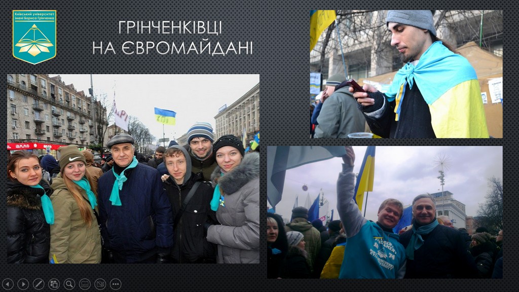Про свій досвід перебування на студентському Євромайдані, восени 2013 року з першокурсниками поділився пан Євгеній. Він розповів, що одразу після відмови уряду Азарова від руху в бік євроінтеграції та оголошення про зустріч під Стелою Незалежності 21листопада 2013 року був серед молоді, що обурилася таким рішенням. Частина молоді, що вийшла у той вечір на площу, розійшлася, а частина залишилася відстоювати право України на шлях повернення до Європи. Усі очікували, що 28-29 листопада на зустрічі з представниками Євросоюзу договір про тісну співпрацю та євроінтеграцію таки буде підписано, та цього так і не сталося в ті дні. Тоді влада України відповіла протестувальникам жорстким розгоном у ніч з 29 на 30 листопада. А вже 1 грудня 2013 р. у Києві на Майдан вийшов понад 1 мільйон людей. Так почалася Революція Гідності. На ранок 1 грудня ми усі побачили звернення нашого ректорату з висловленням протесту проти таких дій влади. Це було надзвичайно важливо для кожного з грінченківців – знати, що колектив університету на боці справедливості. Євгеній Сафар’янс наголосив на тому, що молоді вкрай важливо відсоювати свою гідність та боротися за власне майбутнє.