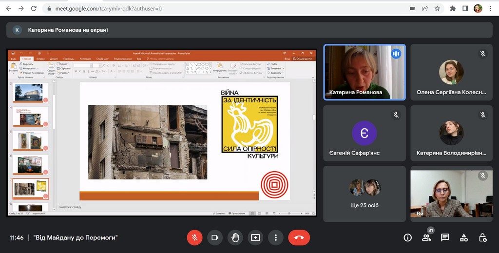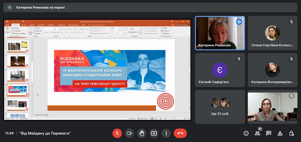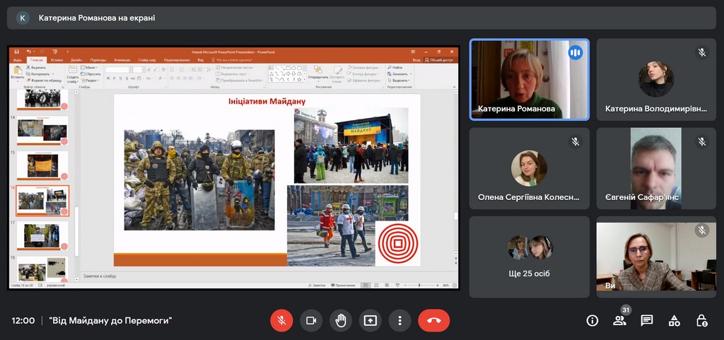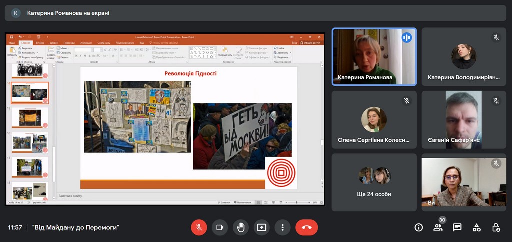 Катерина Романова представила концепцію створення майбутнього меморіального комплексу «Героїв Небесної сотні – Музей Революції Гідності». Вона розповіла скільки дослідницьких матеріалів було зібрано за ці роки: фото та відео документи, особисті та загальні речі майданівців, проведено записи інтерв’ю з учасниками тих подій. Наголосила на тому, що головними перевагами Майдану були - самоорганізація, волонтерська підтримка усіх починань, віра у перемогу народу. Також пані Катерина зазначила, що повномасштабне вторгнення російських військ в Україну, 24 лютого цього року, позначилося і на роботі їх музею, адже значна кількість учасників Революції Гідності нині захищає Україну, а цьогорічне гасло «Вистояли на Майдані – переможемо у війні!» як ніколи відповідає здобуткам українського народу та ЗСУ.