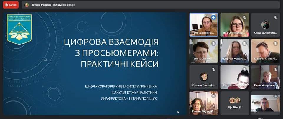 В межах тренінгових програм Школи кураторів Університету Грінченка 22 лютого 2023 року відбувся вебінар для викладачів з практичними кейсами по створенню власного контенту, з метою взаємодії з просьюмерами. Своїми напрацюваннями та секретами створення контену ділилася Тетяна Поліщук, старший викладач кафедри реклами та зв’язків з громадськістю.