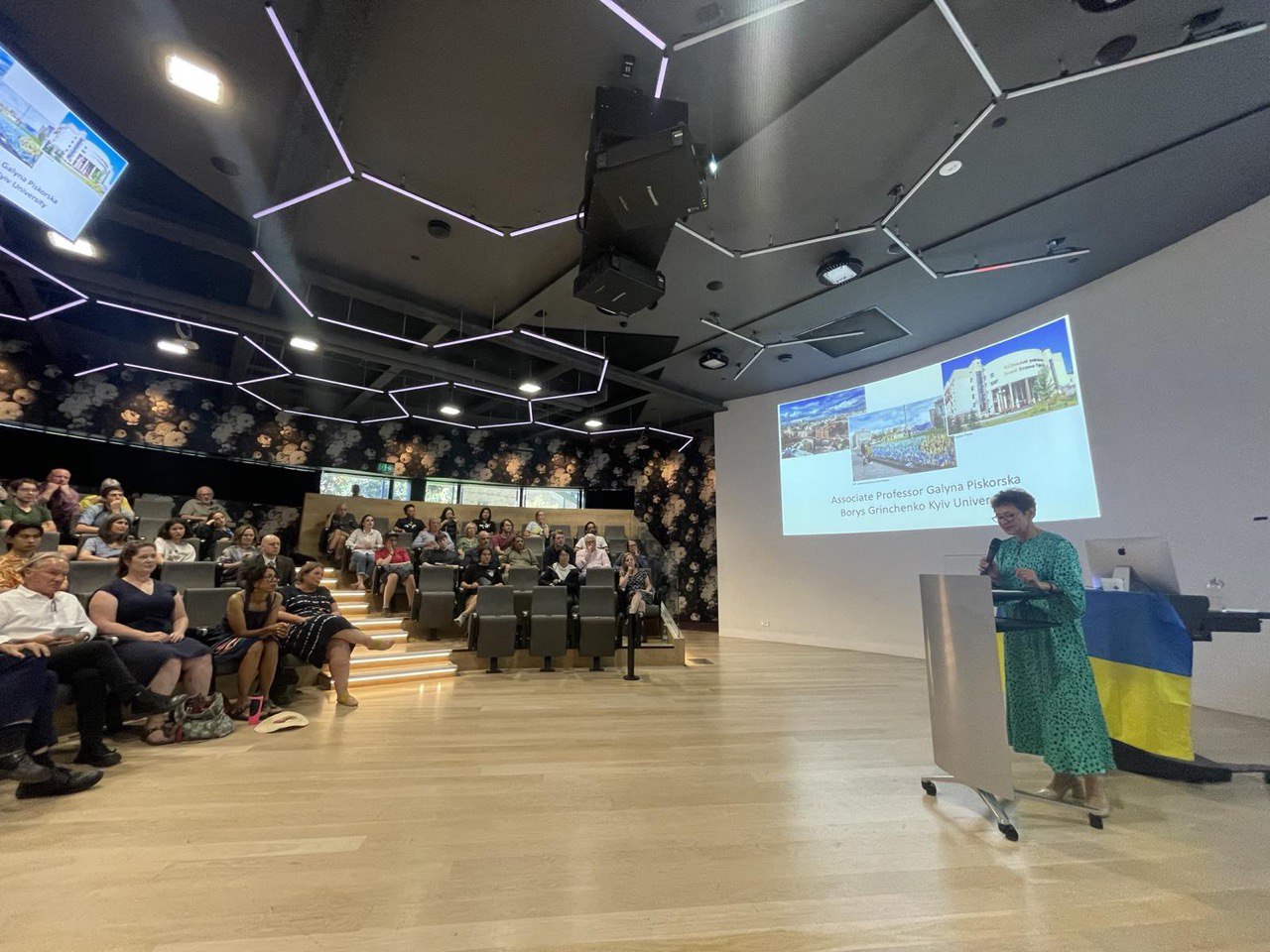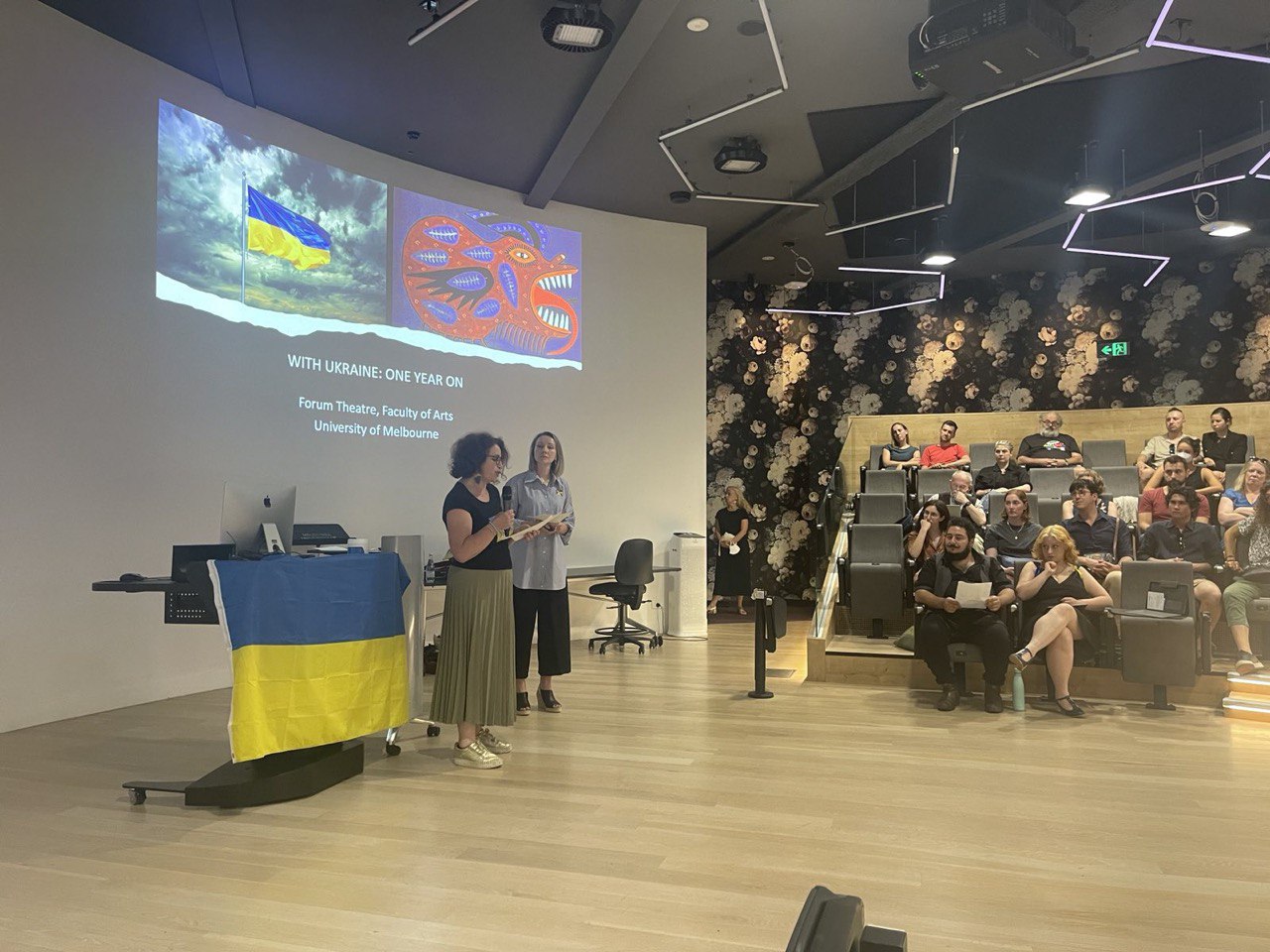 24 лютого 2023 року з нагоди річниці опору України проти російської агресії за ініціативи доцента кафедри реклами та зв'язків з громадськістю Галини Піскорської спільно зі Школою культури та комунікаціїї (SCC), Школою мов та лінгвістик (SOLL), Школою історичних та філосовських досліджень (SHAPS), Факультетом мистецтв Школи Мельбурна ініціювали зустріч професора кафедри австралійської літератури Буабув’є Тоні Берчем (Університет Мельбурна), доктора Джулі Федор (SHAPS, Університет Мельбурна), доктора Ольги Максвелл (SOLL, Університет Мельбурна), почесного професора україністики Марка Павлишина (Університет Монаш), доцента Марії Тумаркіної (SCC, Університет Мельбурна) зі студентами Євгенією Горбуновою, Яною Мицько, Катериною Бучмою(Факультет журналістики Київського університету імені Бориса Грінченка), а також із професором Оленою Гурко (ДНУ імені Олеся Гончара), професором Наталією Кудрявцевою (Криворізький державний педагогічний університет / Hanse Institute for Advanced Study, Delmenhorst), Євгеном Захарченком (Історичний факультет Харківського національного університету імені В. Н. Каразіна), Адою Вордсворт (KHARPP – Проект Харкова та Перемишля / Оксфордський університет).