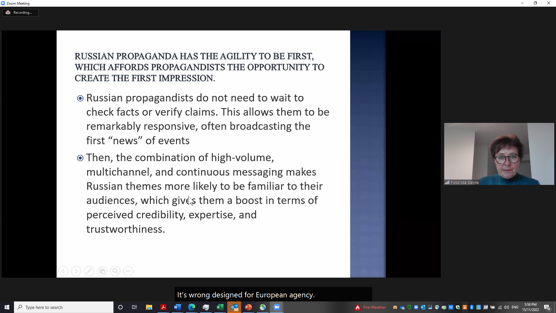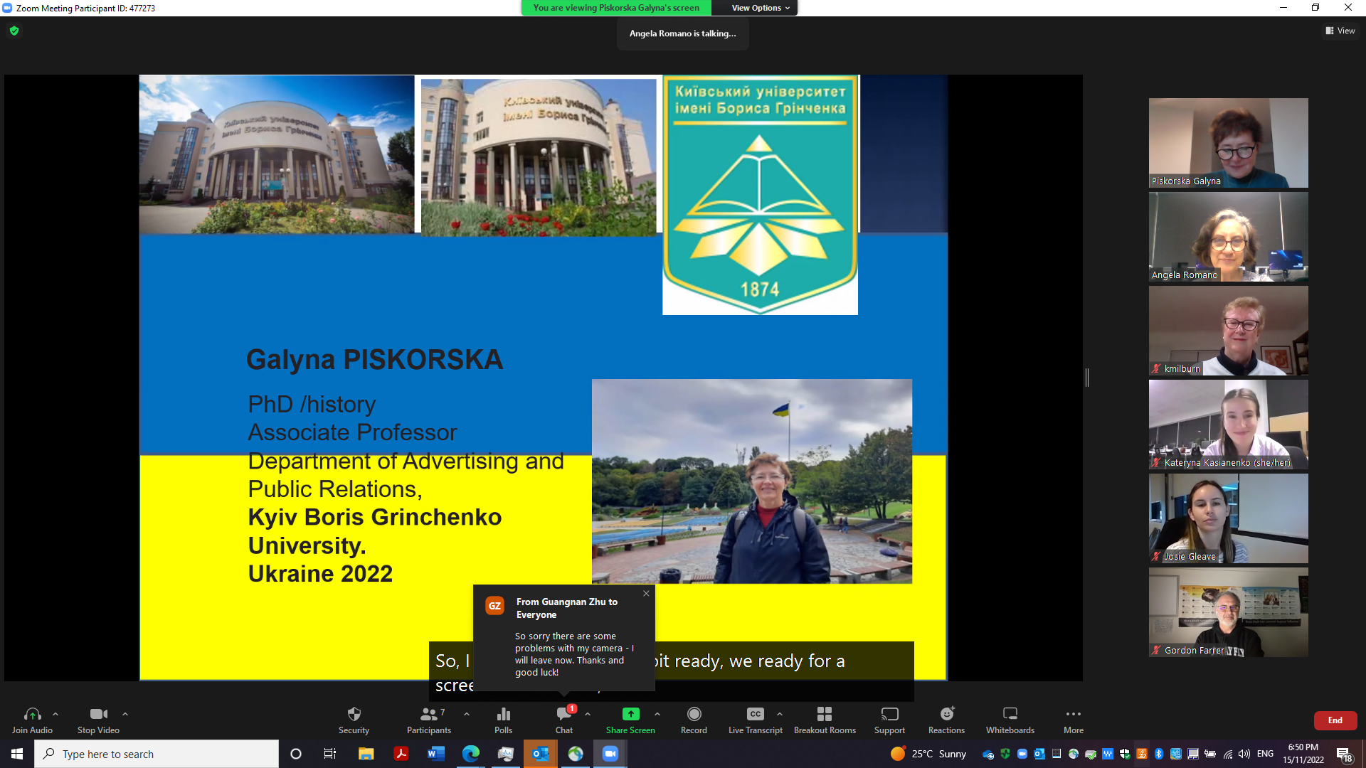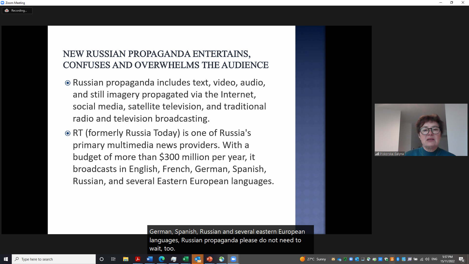 - 22 вересня 2022 р. — науковий семінар для керівництва, викладачів та аспірантів Школи культури та комунікації Університету Мельбурна. На цьому семінарі в доповіді Піскорської Г.А. на тему «Війна наративів: битва за правду» висвітлювалося вторгнення Росії в Україну як одна з найбільших криз у сфері прав людини та гуманітарна катастрофу у Європі після Другої світової війни. Відбулася дискусія у контексті проблем, що були поставлені у доповіді. Науковці погодилися з аргументами та висновками Галини Піскорської щодо природи та наслідків найбільшої після Другої Світової війни у Європі. Цей військовий конфлікт перебуває на перехідній стадії від війни між державами до війни між націями, з руйнівними наслідками, що призводять до ворожнечі між воюючими народами упродовж століть. Це війна за існування України. У разі поразки у цій війні, окрім втрати політичного суверенітету, країні загрожує ще більш жорстокі «чистки» та винищення цивільного населення, більш жорстоке придушення мовної, культурної та релігійної ідентичності. Поняття «не все так однозначно» зараз є ключовим для зовнішніх комунікацій держави-агресора. Між вторгненням в Україну та попередніми успішними актами агресії Путіна є принципова різниця. Цього разу Путін програв піар-війну. Світова громадська думка, завдяки роботі українських та західних журналістів, встала на підтримку України.