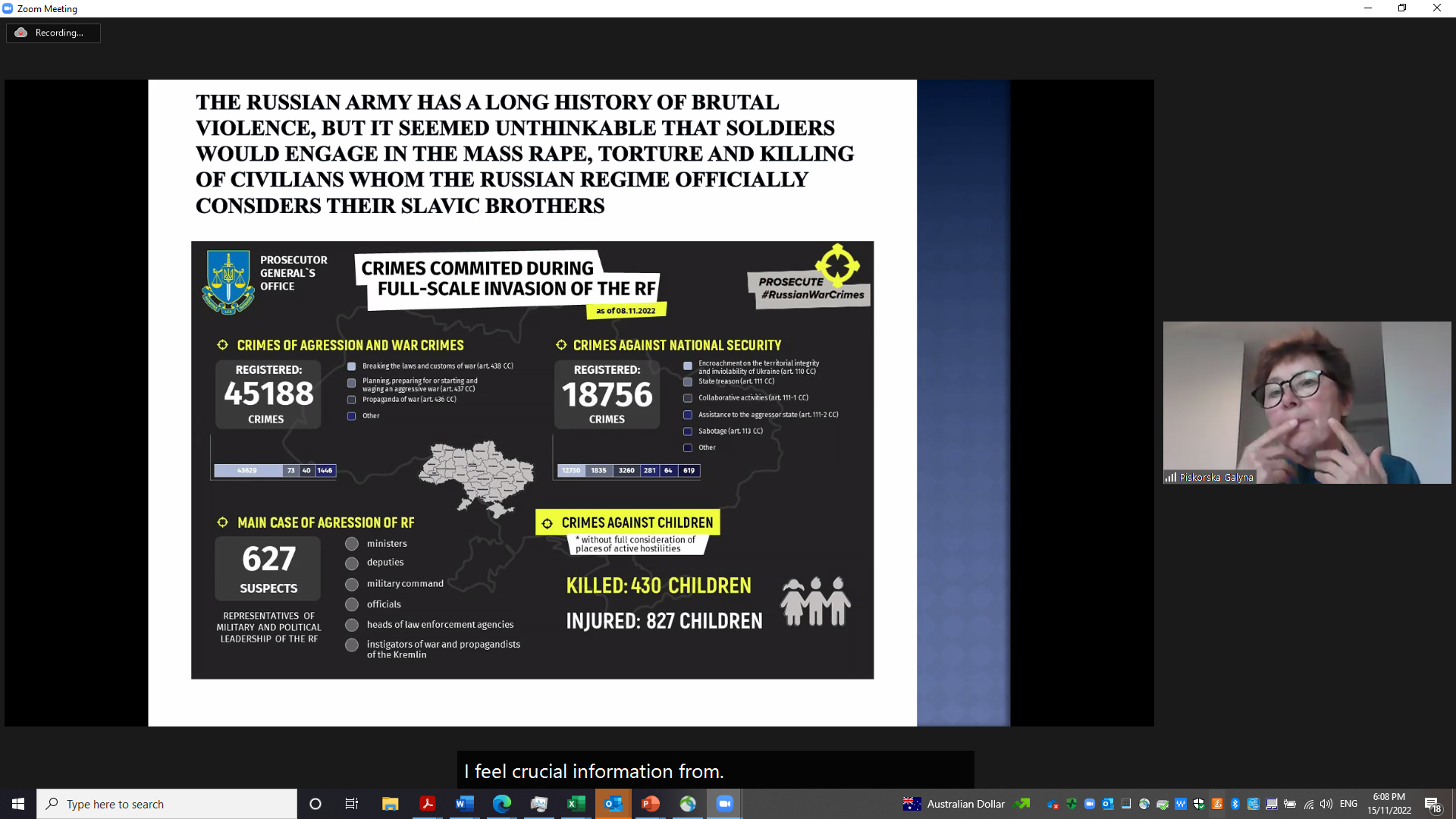 - 12 вересня 2022 р. — гостьова лекція на тему «Українська культура, минула і сучасна в умовах російської агресіі стає лінією захисту цінностей демократії» студентам Університету Мельбурну;