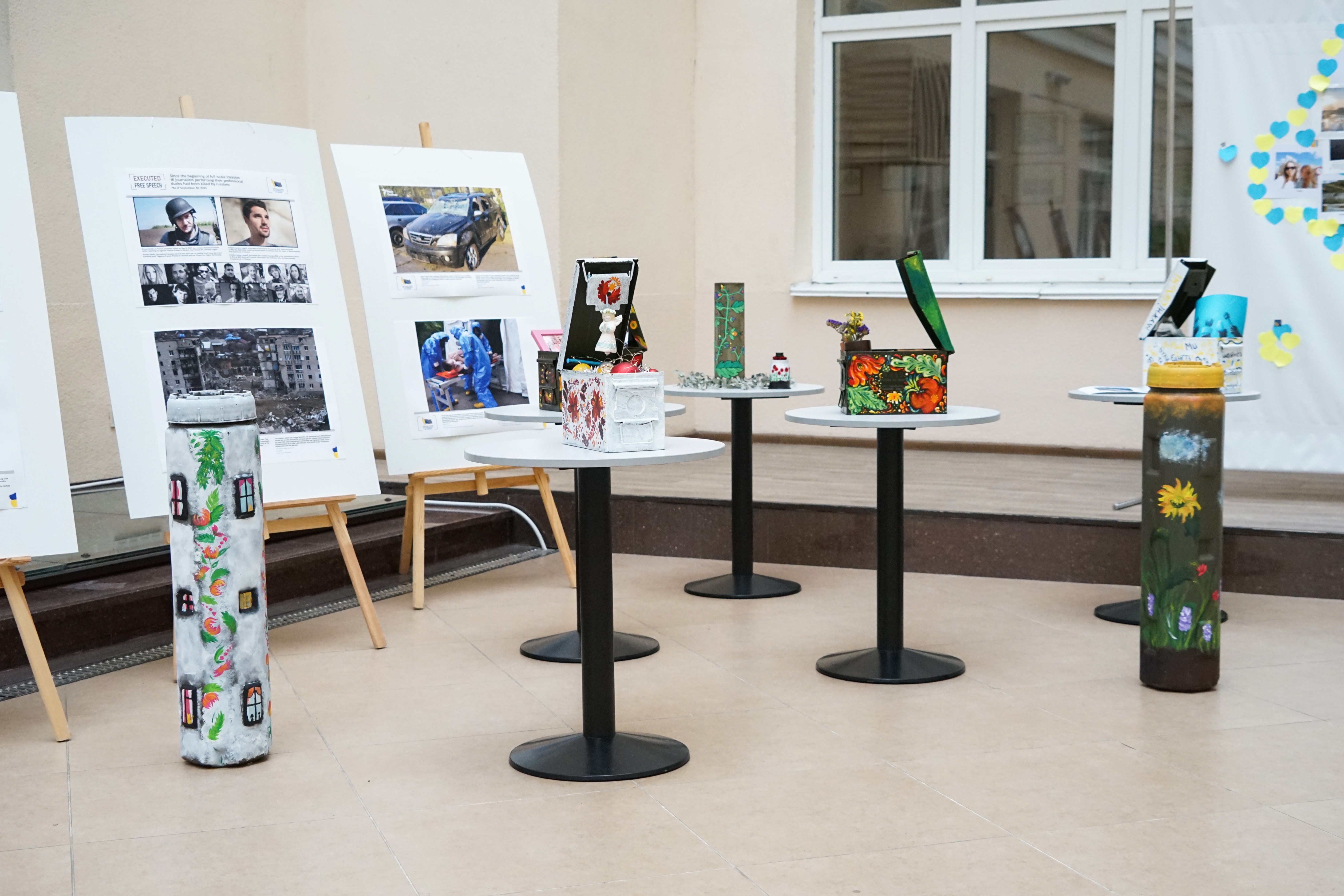 Експозиція військової атрибутики, власноруч розписаної студентами під час спільного майстер-класу, демонструє не лише талант, але й вміння перетворювати страшну смертоносну зброю в предмети краси. Таким чином грінченківські студенти не лише намагаються показати власну позицію, але й реалізувати свою безпосередню мету - допомогти Збройним силам України скоріше здолати ворога і мати можливість знову повернутися до своїх Місць щасливих людей. Усі атрибути, розписані студентами, будуть передані підрозділам, у яких воюють їх викладачі та волонтерам задля подальшої допомоги ЗСУ.