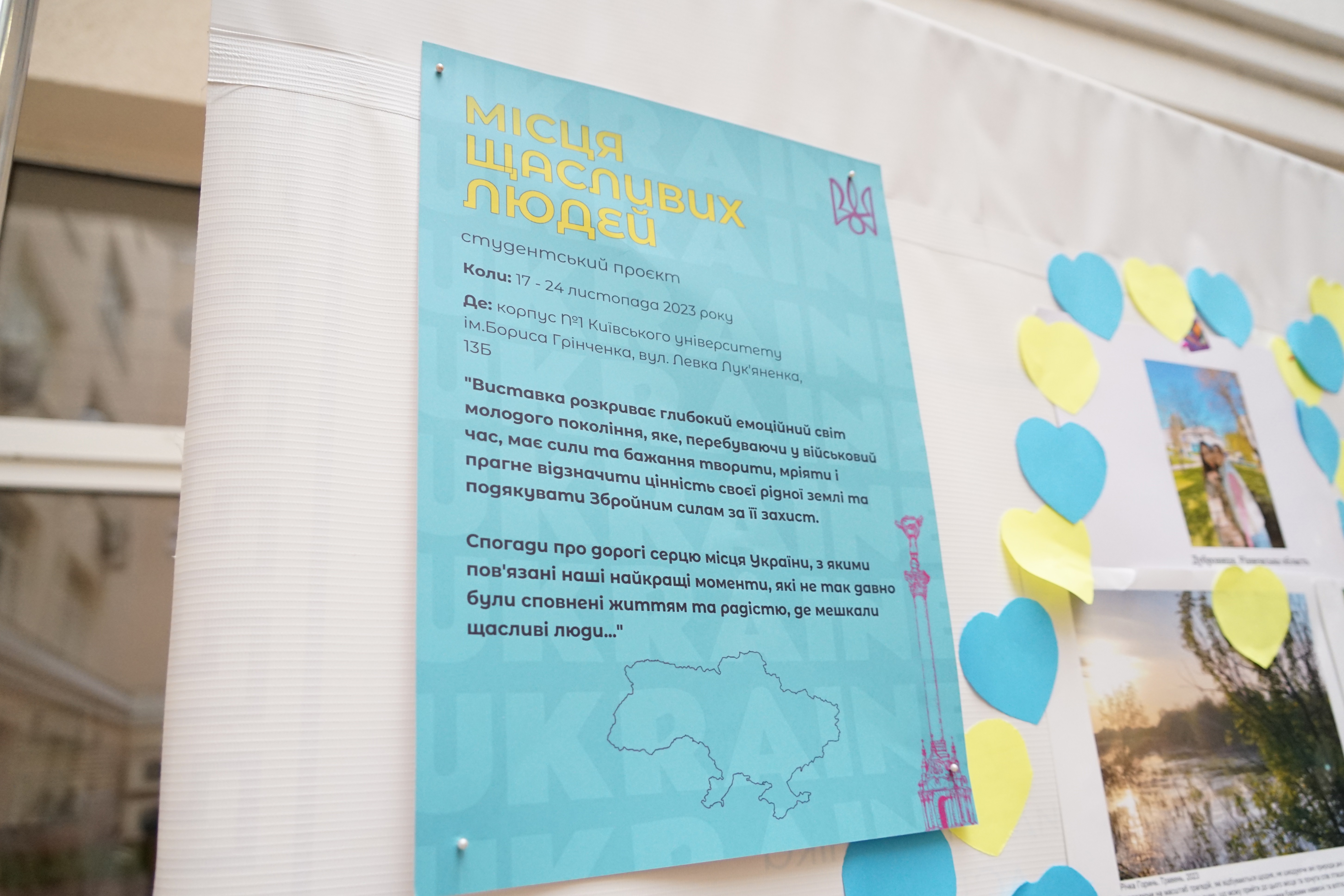 На долю української молоді випали непрості випробування – війна, пандемія COVID-19, повномасштабне вторгнення. Прагнучи продемонструвати власну незламність та єдність студенти 3-х факультетів Університету Грінченка підготували спільний проєкт-виставку із символічною назвою «Місця щасливих людей». Метою даної ініціативи є демонстрація продовження студентського буття, їх внеску в перемогу та щирої надії в світле майбутнє.