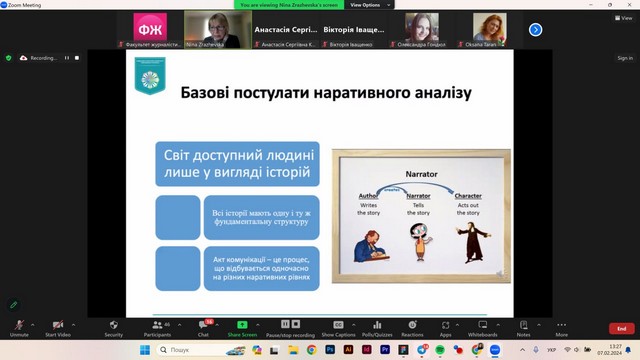 Ко-тренеркою першого навчального дня курсу також була Ніна Зражевська, професорка кафедри міжнародної журналістики, доктор наук із соціальних комунікацій, яка провела вебінар на тему «Наративний аналіз текстів медіакультури».