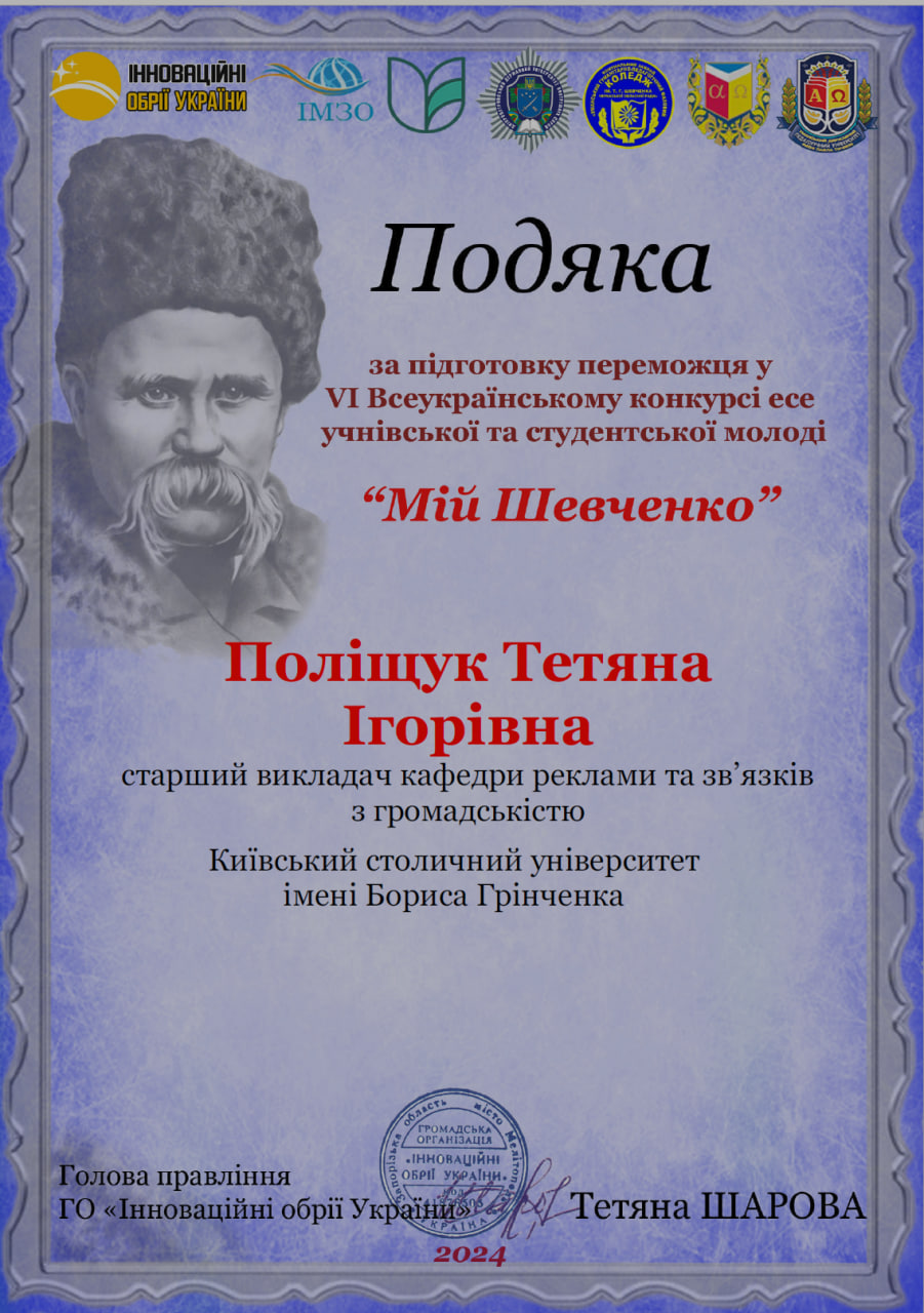 10 березня 2024 року відбулося оголошення переможців VI Всеукраїнського конкурсу есе учнівської та студентської молоді «Мій Шевченко», присвяченого творчості великого Кобзаря.