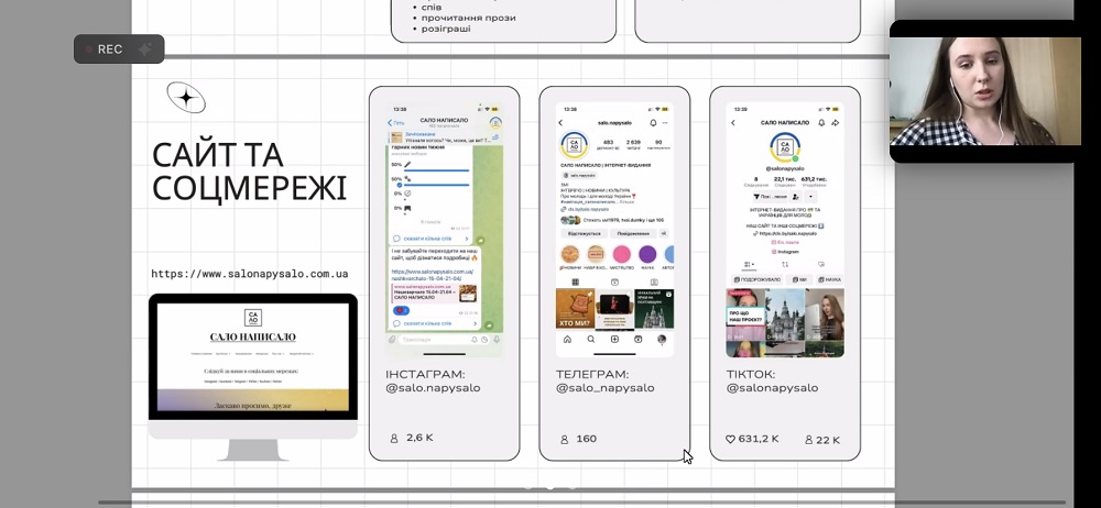 П'ять вечорів насичених тренінгів та практичних кейсів від фахівців у сфері медіа. Перший день розпочався з лекції Яни Фруктової, кандидата педагогічних наук, доцента, доцента кафедри журналістики та нових медіа та котренера Марії Місаїлової (здобувачки 1 курсу магістратури ОП "Медіакомунікації") на тему "Подієва організація комунікації: Порядок денний". Практичною складовою стало представлення успішного медіапроєкту здобувачки 4 курсу освітньої програми "Журналістика" Ксенії Ляпіної — "САЛО НАПИСАЛО".