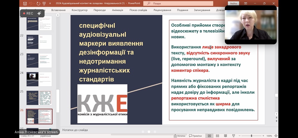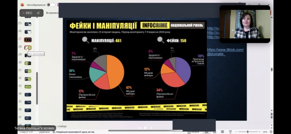 Другий день надихнув усіх лекцією від Аліни Лісневської, кандидата педагогічних наук, доцента, доцента кафедри журналістики та нових медіа та її котренера Владислава Нестерова (здобувача 1 курсу магістратури з ОП "Журналістика") на тему "Аудіовізуальне сприйняття реальності", де магістрант ділився досвідом щодо виявлення маніпуляцій та фейків у відеоконтенті.