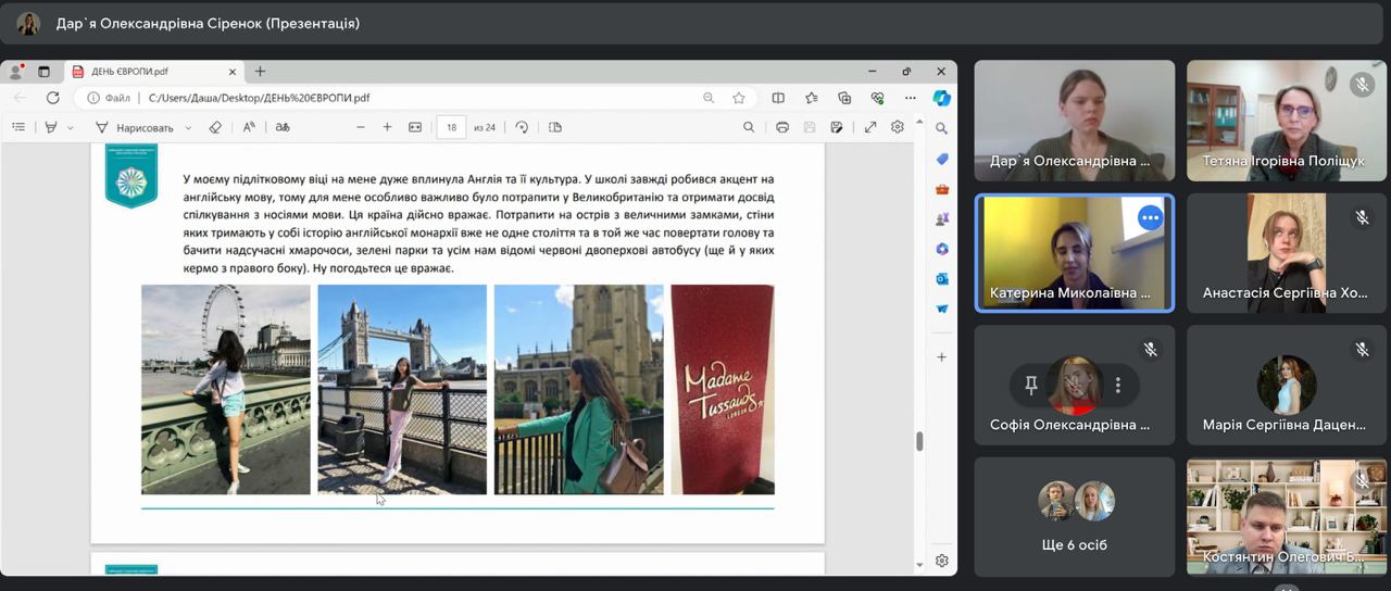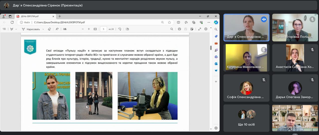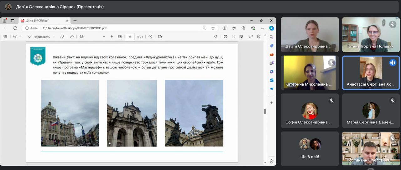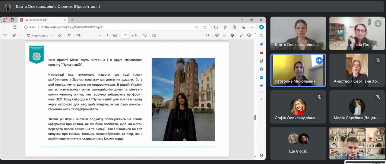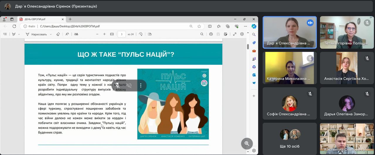 9 травня 2024 року в Україні відзначають День Європи. Це свято Україна вже вдруге відзначає на державному рівні, а на Факультеті журналістики відбувся цікавий тематичний захід. Під час зустрічі зі студентками 4 курсу ОП "Журналістики" Катериною Цап, Дарʼєю Сіренок та Анастасією Хоменко був представлений авторський проєкт — туристичний подкаст "Пульс націй", розроблений у співпраці зі студентським інтернет-радіо "Радіо BG". Гості зустрічі, студенти 2 курсу ОП "Реклама і зв'язки з громадськістю", дізналися історію створення проєкту, зазирнули за завісу роботи на радіо, а також послухали про особливість та важливість висвітлювання туристичних подорожей до країн Європи.