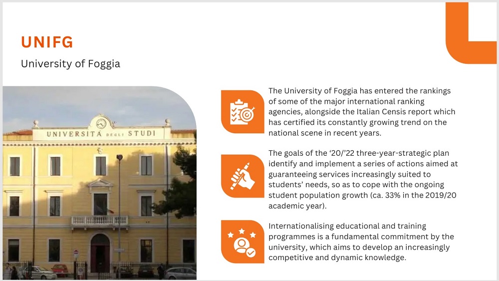 - Університету Фоджі: VEHUB4YOU Project (спільно з залученням партнерів з Італійської Республіки та Латвійської Республіки), The Virtual Innovative Biomedical Education in Science (VIBES) (спільно з Люблінський медичним університетом, Республіка Польща; Левенський католицький університет, Королівство Бельгія; Університет Осло, Королівство Норвегія; Університет Рейк'явіка, Ісландія), Erasmus+ CBHE Project “Synergy of educational, scientific, management and industrial components for climate management and climate change prevention/CLIMAN” (спільно з Університетом Миколаса Ромеріса, Литовська Республіка; Бізнес університетом Туріба, Латвійська Респубілка; Державним університетом імені Акакія Церетелі, Грузія та іншими). International Week 2024 Project, DigiPsyRes LTT4 Project (спільно з Університетом у Крагуєвці, Республіка Сербія; Університетом Казимира Великого, Республіка Польща).