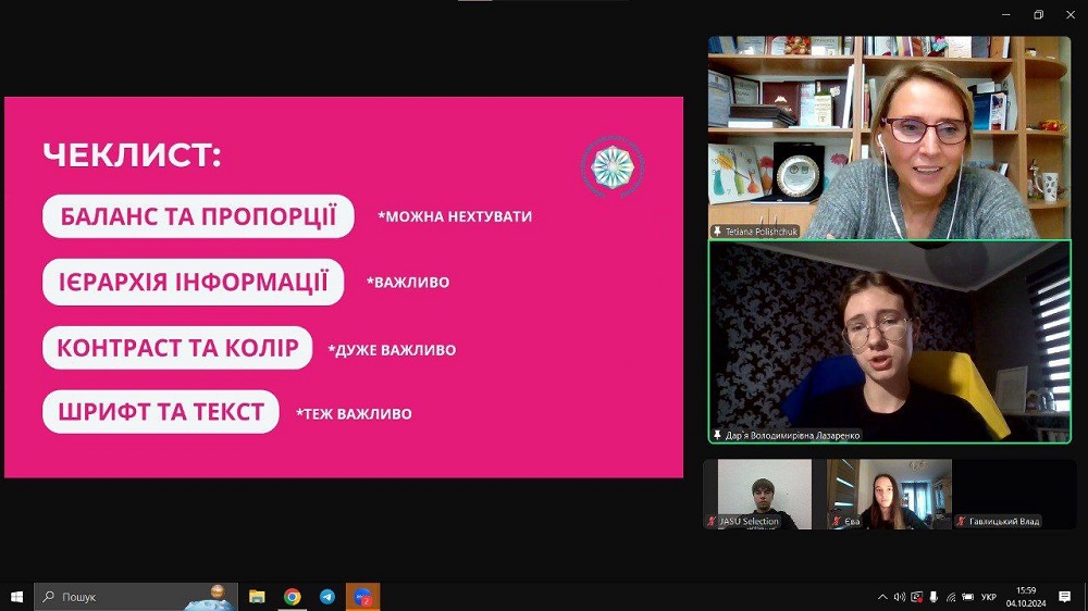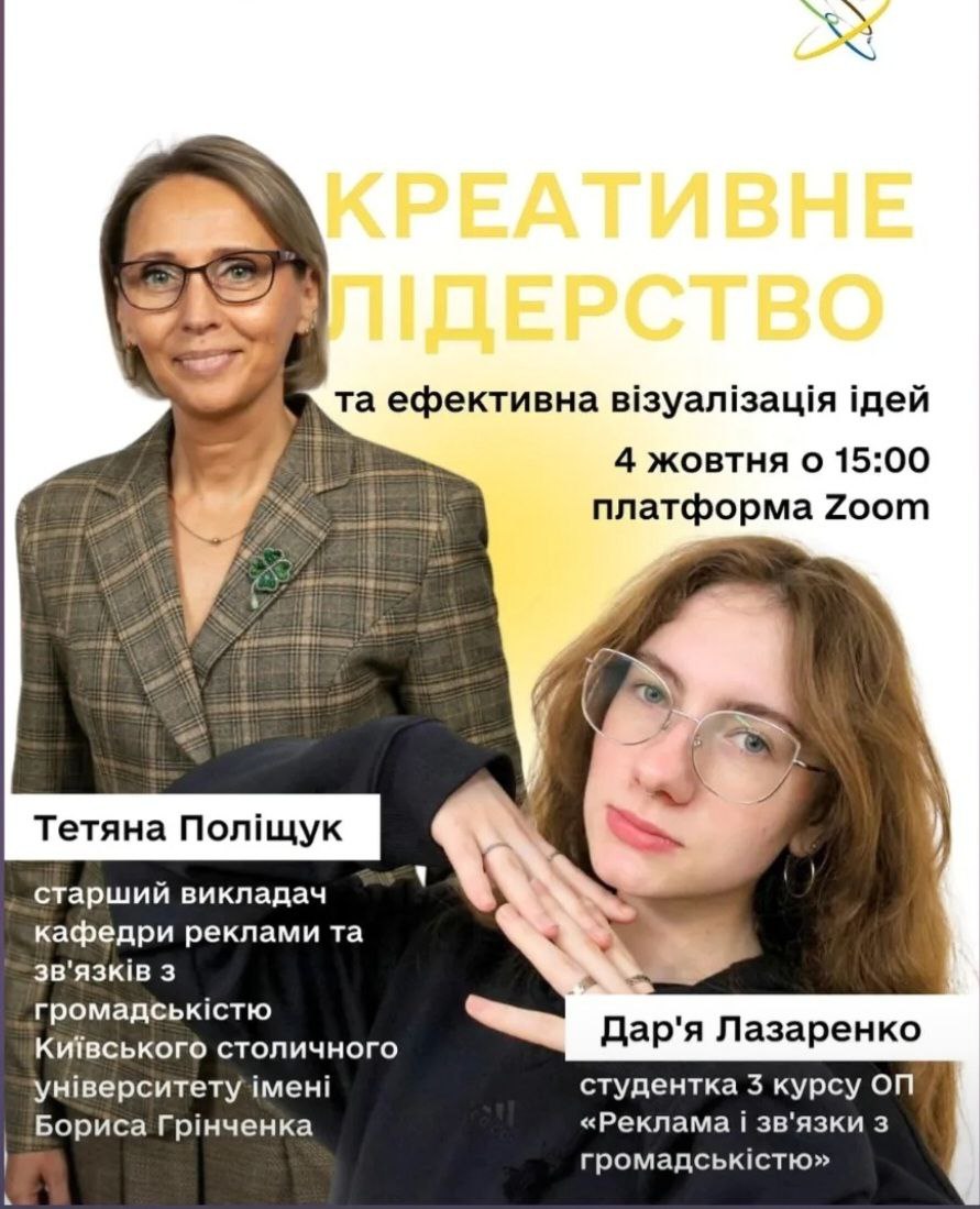 Учні 8-х – 11-х класів з різних куточків України беруть участь конкурсі на екологічну тематику. За їхніми запитами було визначено теми вебінару. Пані Тетяна обговорила з юними геніями тему «Креативного лідерства», звернула увагу слухачів на навчання впродовж життя, щоб залишатися успішним та затребуваним. Дар’я представила тему «Ефективна візуалізація ідей» звернувши увагу на важливість вивчення цікавих прикладів та формування власної бази проєктів. Юні генії засипали доповідачів запитаннями щодо того де шукати натхнення та які платформи допоможуть реалізувати представлення ідей. Організатори були вражені інтерактивним спілкуванням та наперед запросили представників Факультету журналістики виступити ще раз.