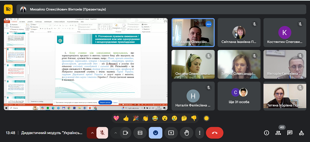Продовжила тренінг Тетяна Горохова, кандидат філологічних наук, доцент кафедри української мови. Тетяна Олександрівна не лише наводила прикдлади змін, а й пропонувала одразу на практиці застосовувати ті з них, що стосуються тематики та специфіки кожного з присутніх.