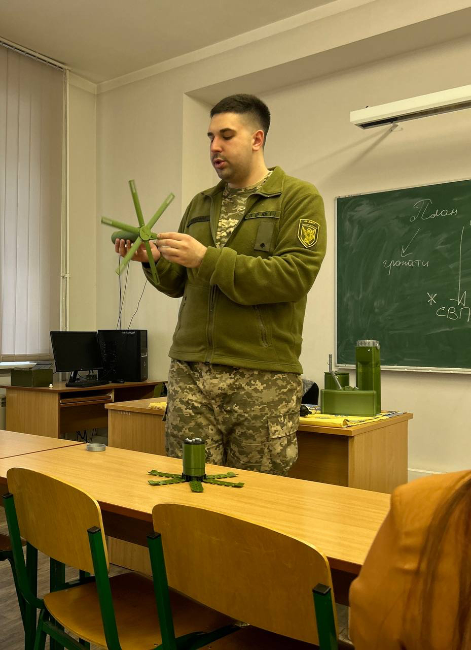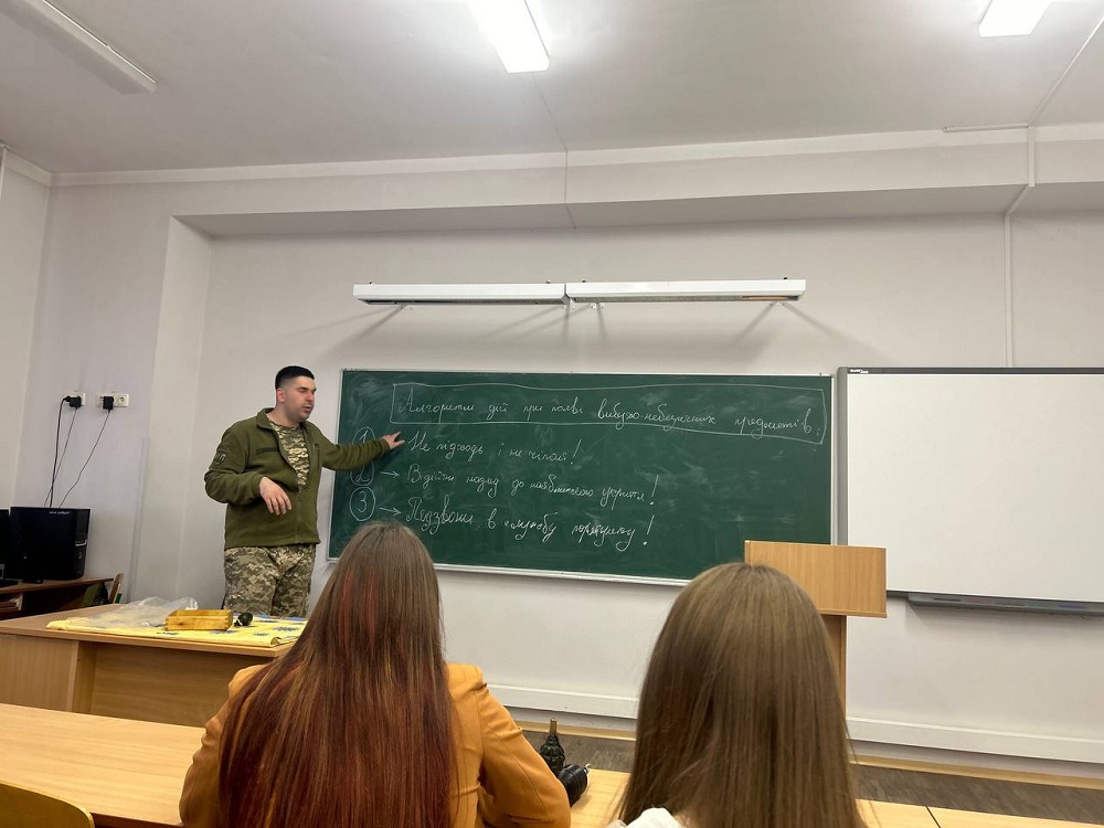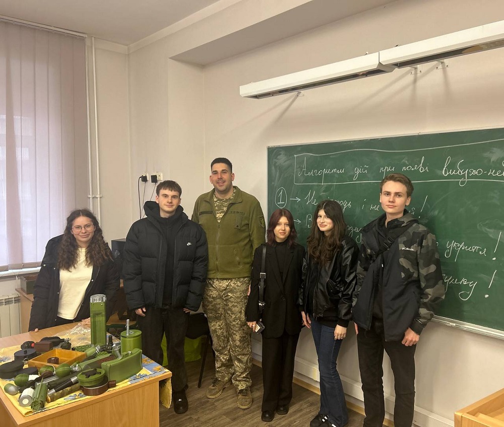 Інструктор Олександр Наливайко пояснив класифікацію боєприпасів, їхні особливості та головне алгоритм дій у разі виявлення загрози. Лекція допомогла студентам краще усвідомити ризики, пов’язані з вибуховими пристроями, та навчитися правильно реагувати в небезпечних ситуаціях. Тема мінної безпеки залишається вкрай важливою, адже навіть після завершення війни загроза від нерозірваних боєприпасів зберігатиметься протягом довгих років. Ми досі знаходимо боєприпаси ще з Другої світової війни, тож знання про безпеку можуть врятувати життя!