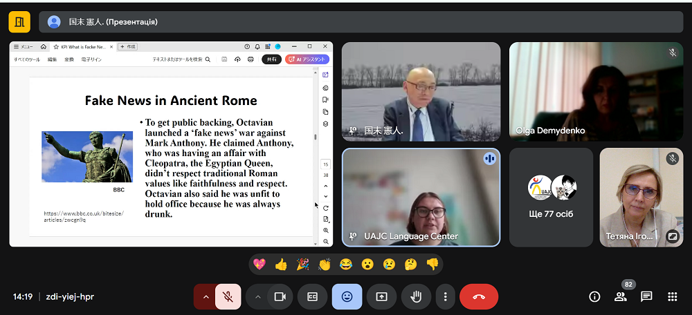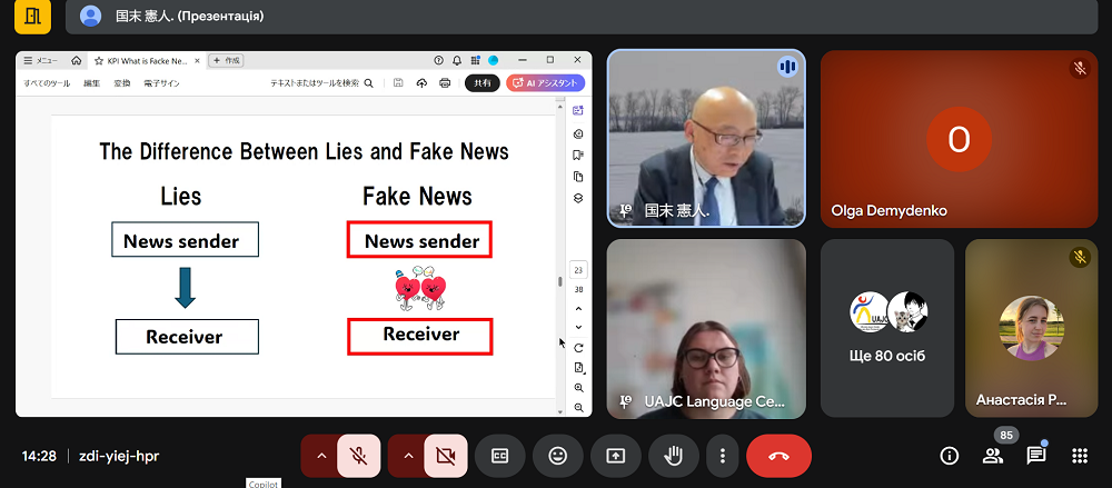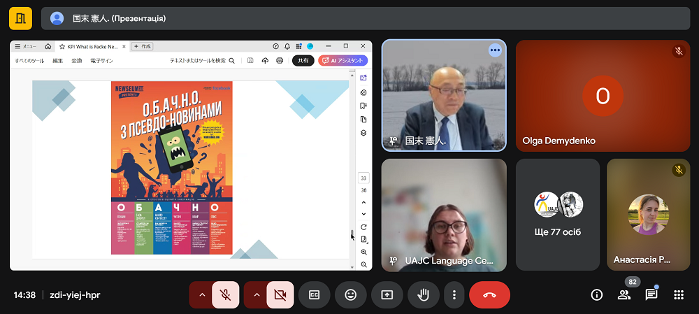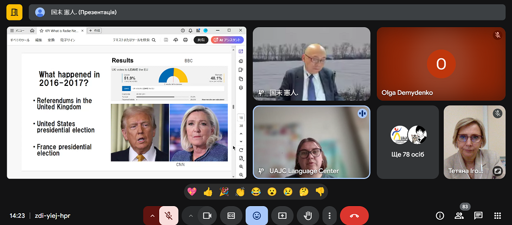 24 квітня 2025 року відбулась гостьова лекція Норіто Кунісуе, лектора факультету лінгвістики університету КПІ ім. Ігоря Сікорського, професора Дослідницького центру передових наук і технологій Токійського університету, який виступив з темою “Фейк ньюз”.
